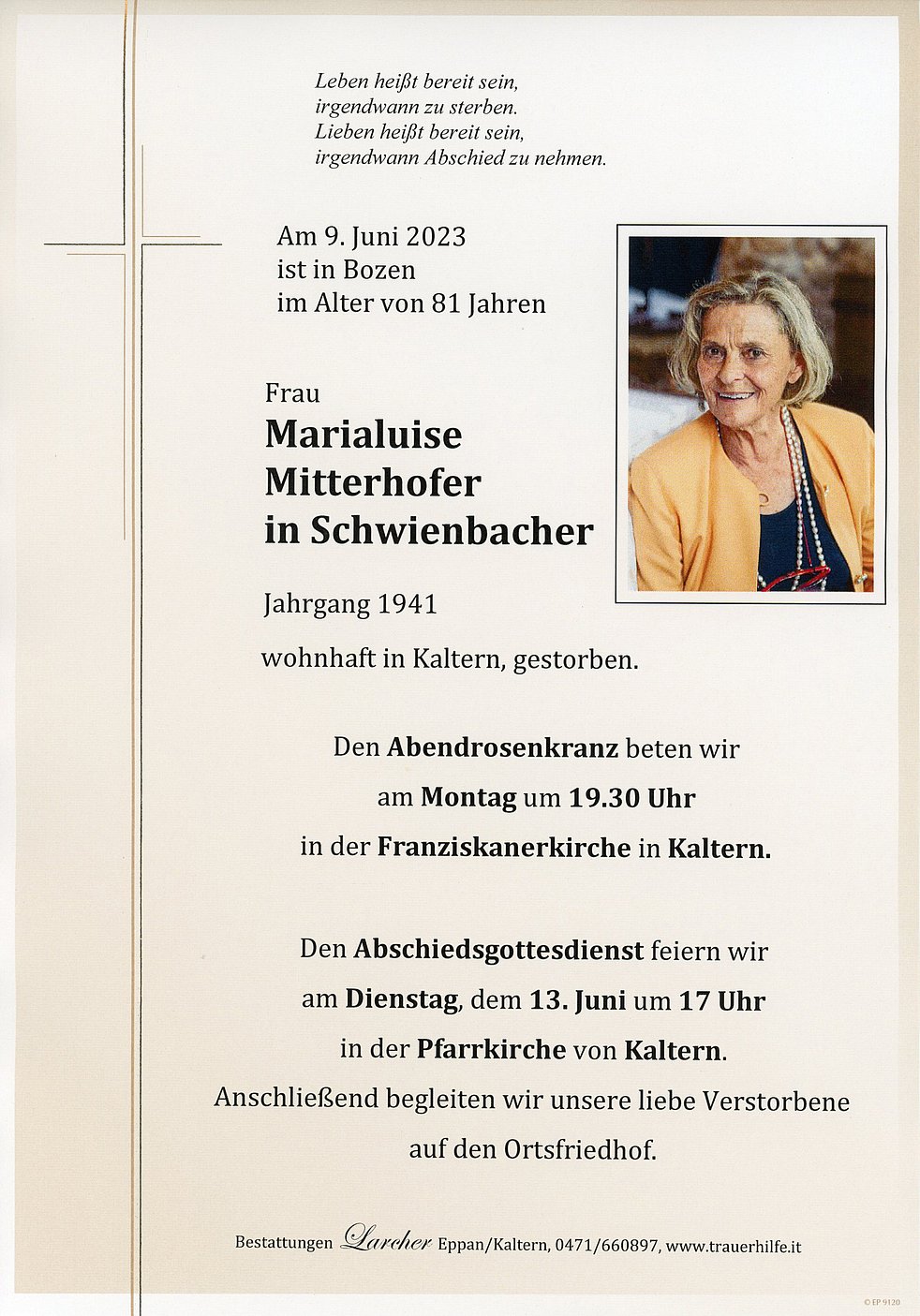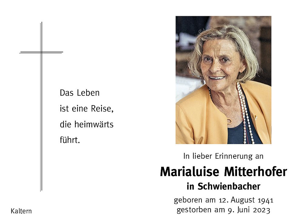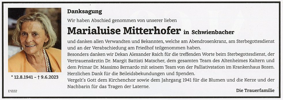 Wir feiern den Abschiedsgottesdienst am Dienstag, dem 13. Juni um 17 Uhr in der Pfarrkirche von Kaltern. Anschließend begleiten wir unsere liebe Verstorbene auf den Ortsfriedhof.