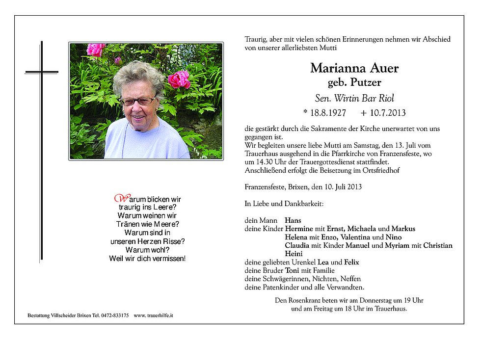 Wir begleiten unsere liebe Mutti am Samstag, den 13. Juli vom Trauerhaus ausgehend in die Pfarrkirche von Franzensfeste, wo
