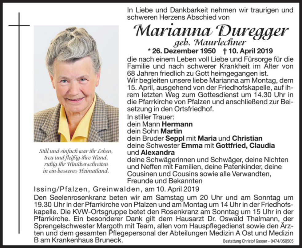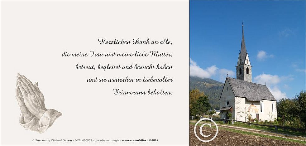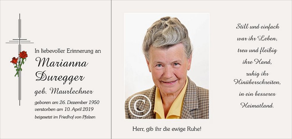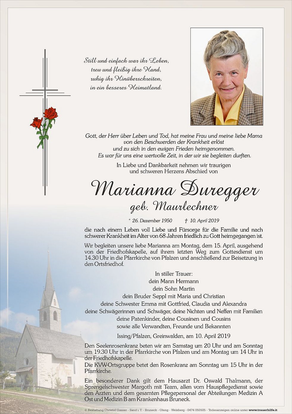 Wir begleiten unsere liebe Marianna am Montag, dem 15. April, ausgehend von der Friedhofskapelle, auf ihrem letzten Weg zum Gottesdienst um 14.30 Uhr in die Pfarrkirche von Pfalzen und anschließend zur Beisetzung in den Ortsfriedhof.