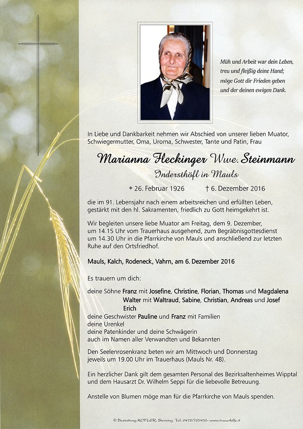 Wir begleiten unsere liebe Muator am Freitag, dem 9. Dezember, um 14.15 Uhr vom Trauerhaus ausgehend, zum Begräbnisgottesdienst um 14.30 Uhr in die Pfarrkirche von Mauls und anschließend zur letzten Ruhe auf den Ortsfriedhof.