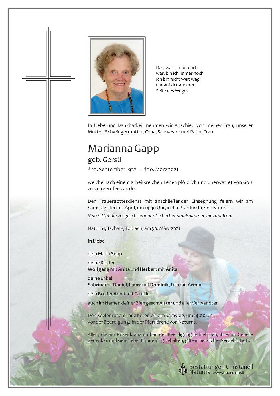Den Trauergottesdienst mit anschließender Einsegnung feiern wir am Samstag, den 03. April, um 14.30 Uhr, in der Pfarrkirche von Naturns.