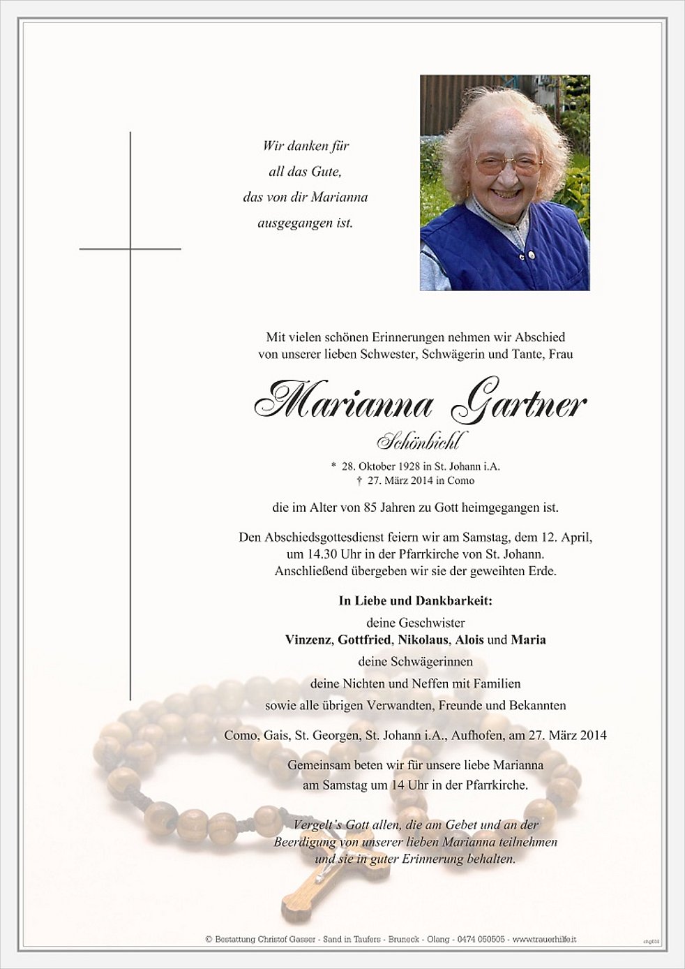 die im Alter von 85 Jahren zu Gott heimgegangen ist.