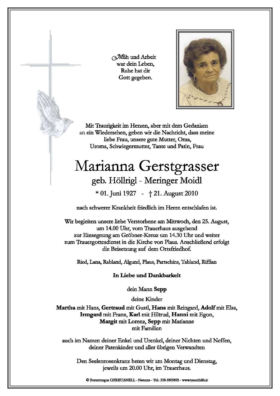 Wir begleiten unsere liebe Verstorbene am Mittwoch, den 25. August, um 14.00 Uhr, vom Trauerhaus ausgehend zur Einsegnung am Gröbner-Kreuz um 14.30 Uhr und weiter zum Trauergottesdienst in die Kirche von Plaus. Anschließend erfolgt die Beisetzung auf dem Ortsfriedhof.
