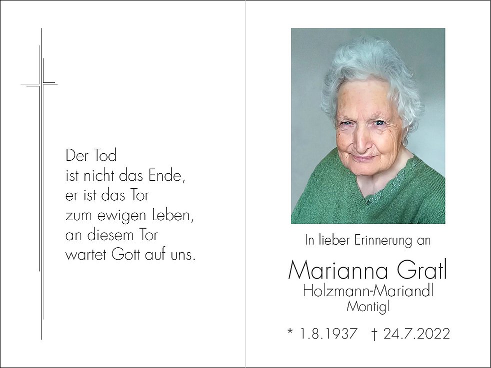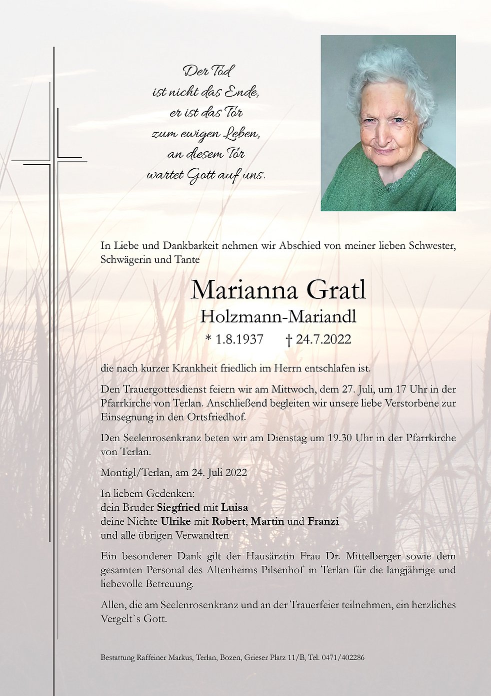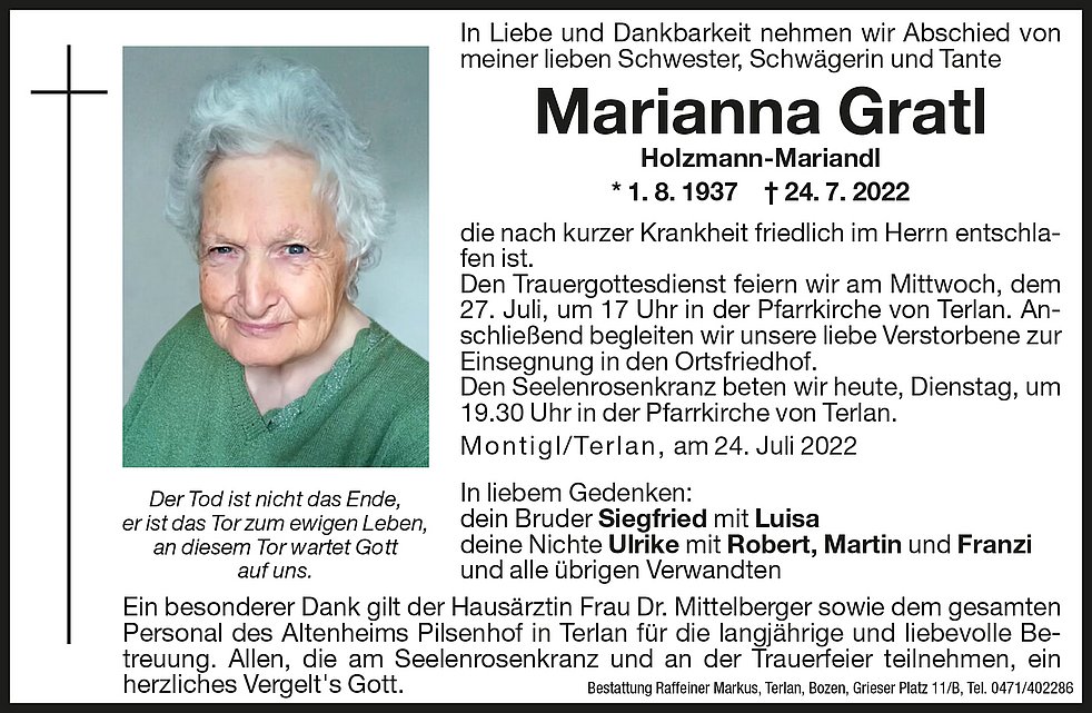 Den Trauergottesdienst feiern wir am Mittwoch, dem 27. Juli, um 17 Uhr in der Pfarrkirche von Terlan. Anschließend begleiten wir unsere liebe Verstorbene zur Einsegnung in den Ortsfriedhof.