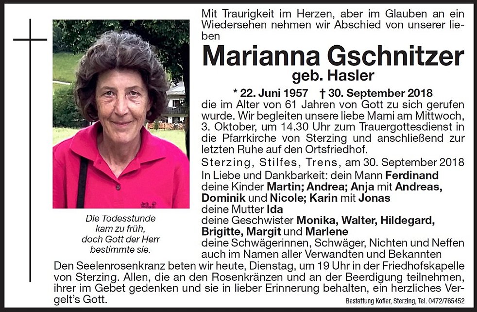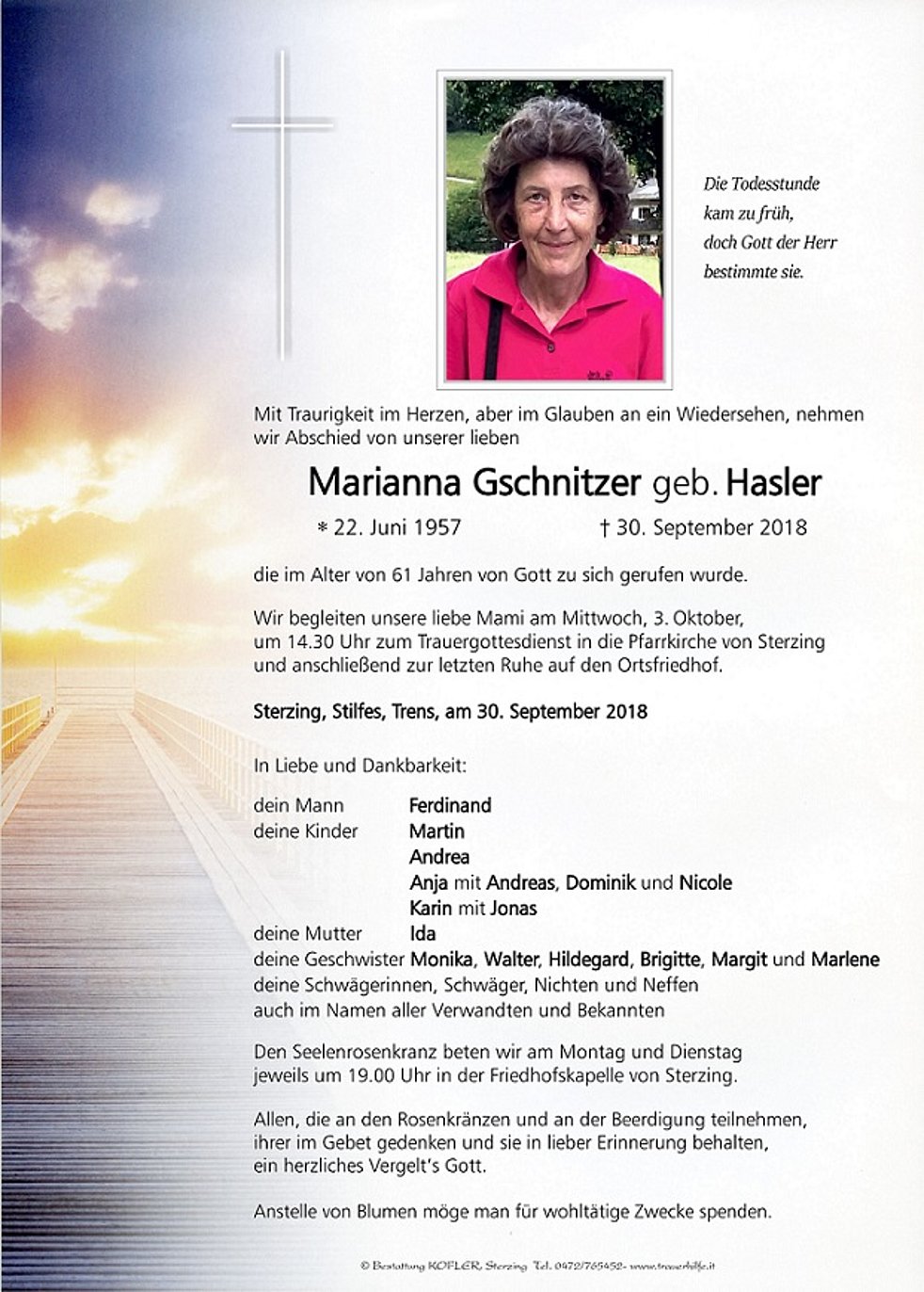 Wir begleiten unsere liebe Mami am Mittwoch, 3. Oktober, um 14.30 Uhr zum Trauergottesdienst in die Pfarrkirche von Sterzing und anschließend zur letzten Ruhe auf den Ortsfriedhof.