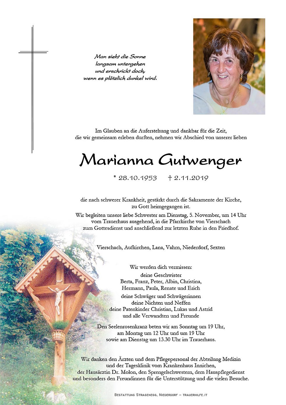 Wir begleiten unsere liebe Schwester am Dienstag, 5. November, um 14 Uhr vom Trauerhaus ausgehend, in die Pfarrkirche von Vierschach zum Gottesdienst und anschließend zur letzten Ruhe in den Friedhof.