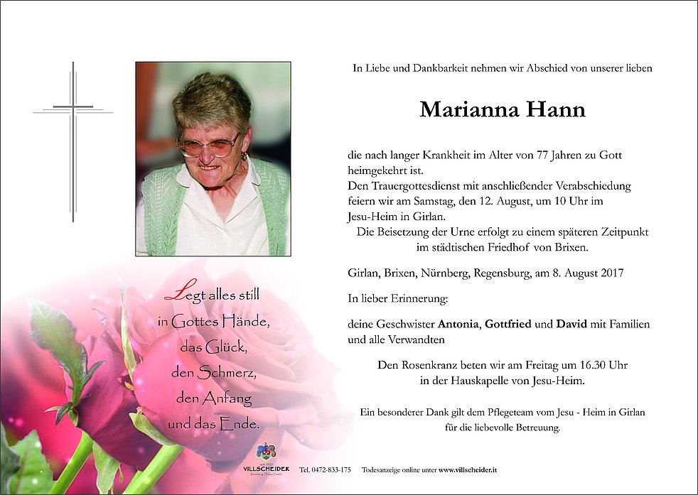 Ein besonderer Dank gilt dem Pflegeteam vom Jesu - Heim in Girlan