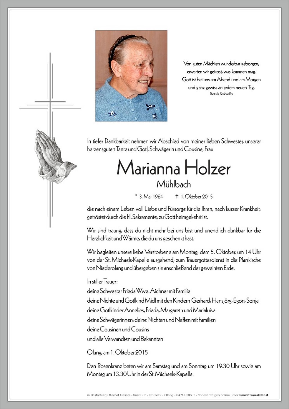 Wir begleiten unsere liebe Verstorbene am Montag, dem 5. Oktober, um 14 Uhr von der St. Michaels-Kapelle ausgehend, zum Trauergottesdienst in die Pfarrkirche von Niederolang und übergeben sie anschließend der geweihten Erde.