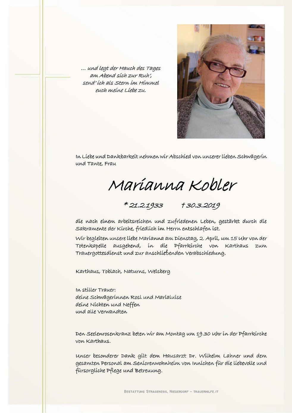 Wir begleiten unsere liebe Marianna am Dienstag, 2. April, um 15 Uhr von der Totenkapelle ausgehend, in die Pfarrkirche von Karthaus zum Trauergottesdienst und zur anschließenden Verabschiedung.