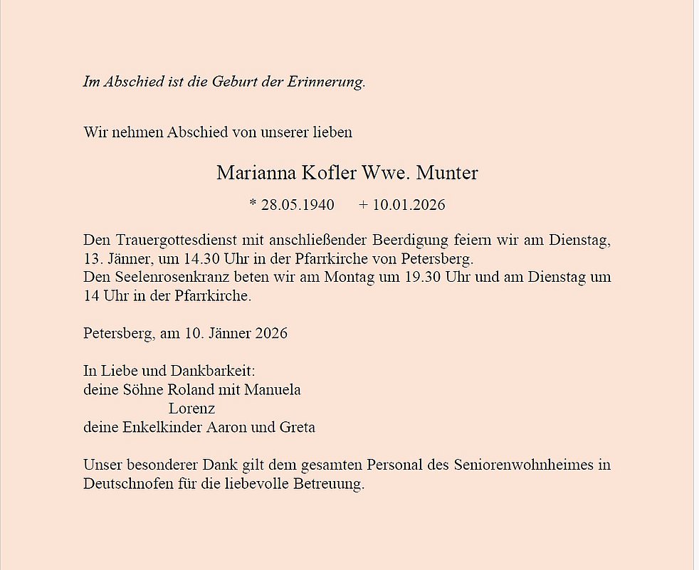 Liebe Marianna, ruhe in Frieden und bleib deiner Familie mit deinem Segen nahe🙏
