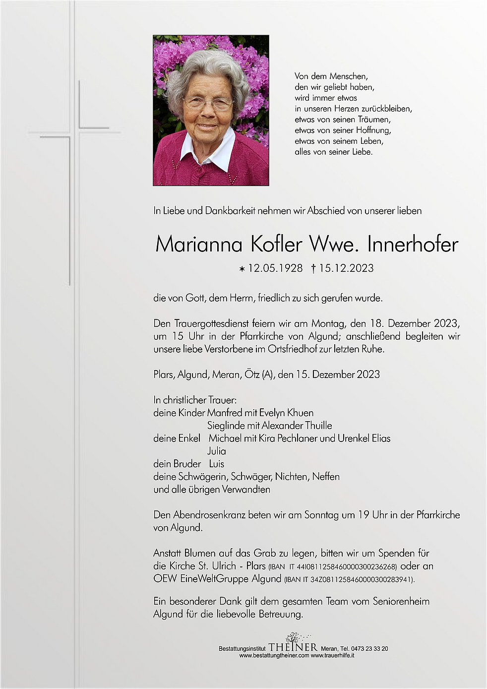 Den Trauergottesdienst feiern wir am Montag, den 18. Dezember 2023, um 15 Uhr in der Pfarrkirche von Algund; anschließend begleiten wir unsere liebe Verstorbene im Ortsfriedhof zur letzten Ruhe.