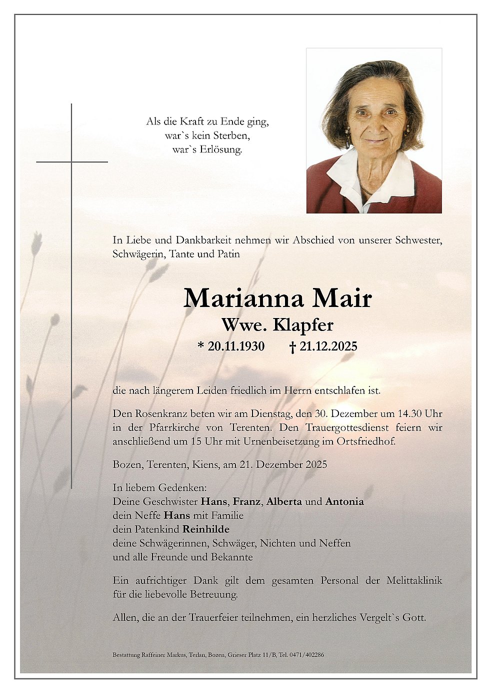 Trauerfeier: 30.12. - 15:00 Uhr in der Pfarrkirche von Terenten