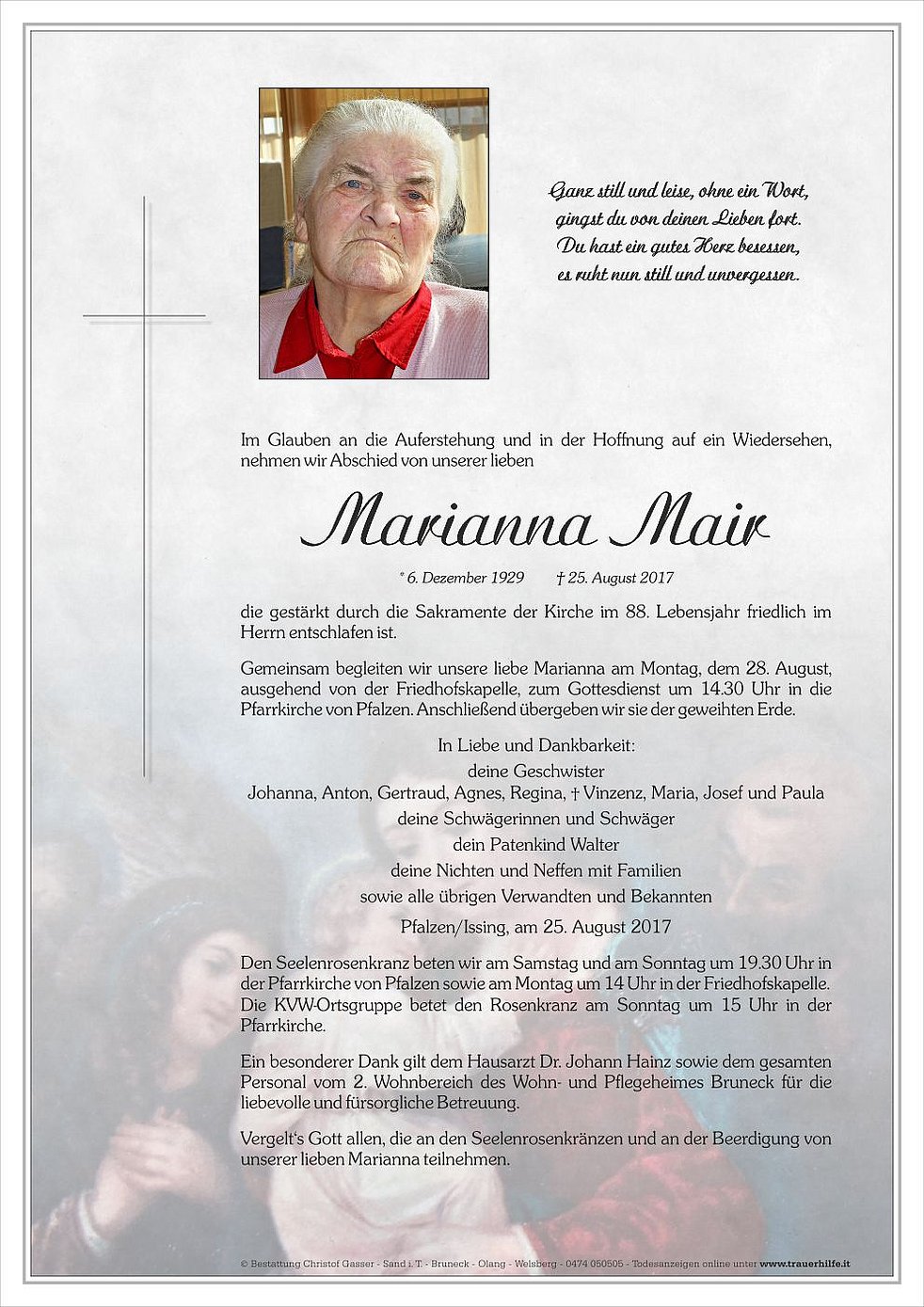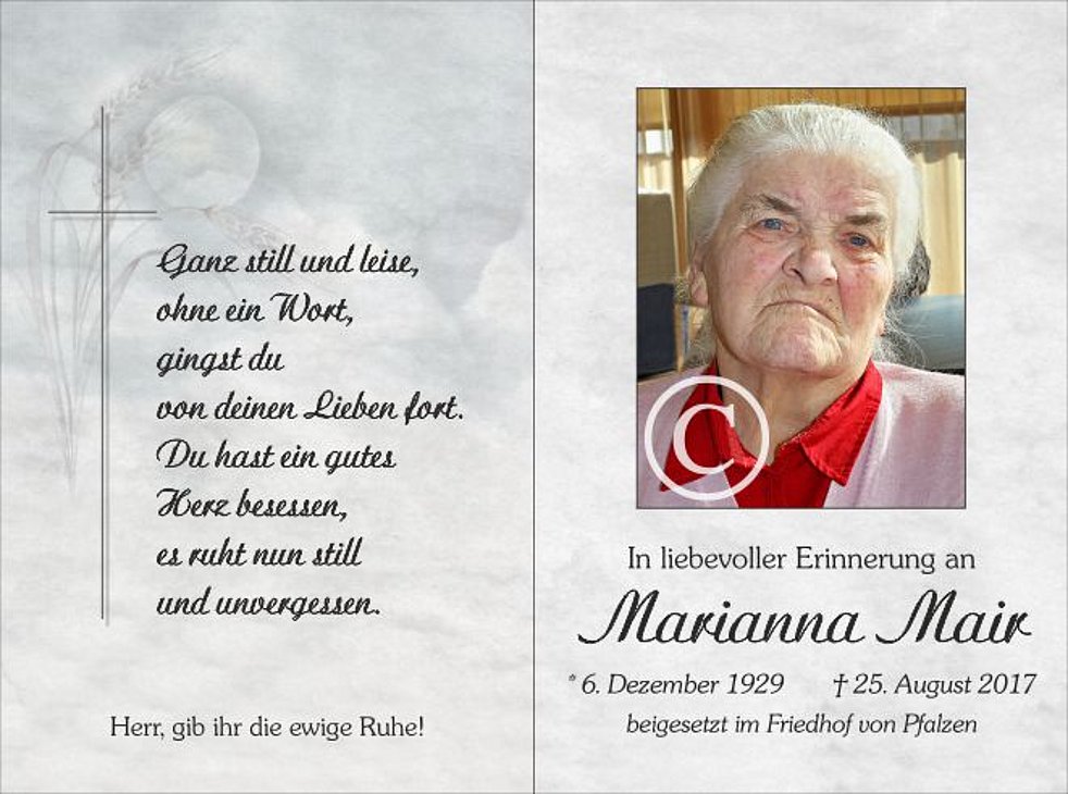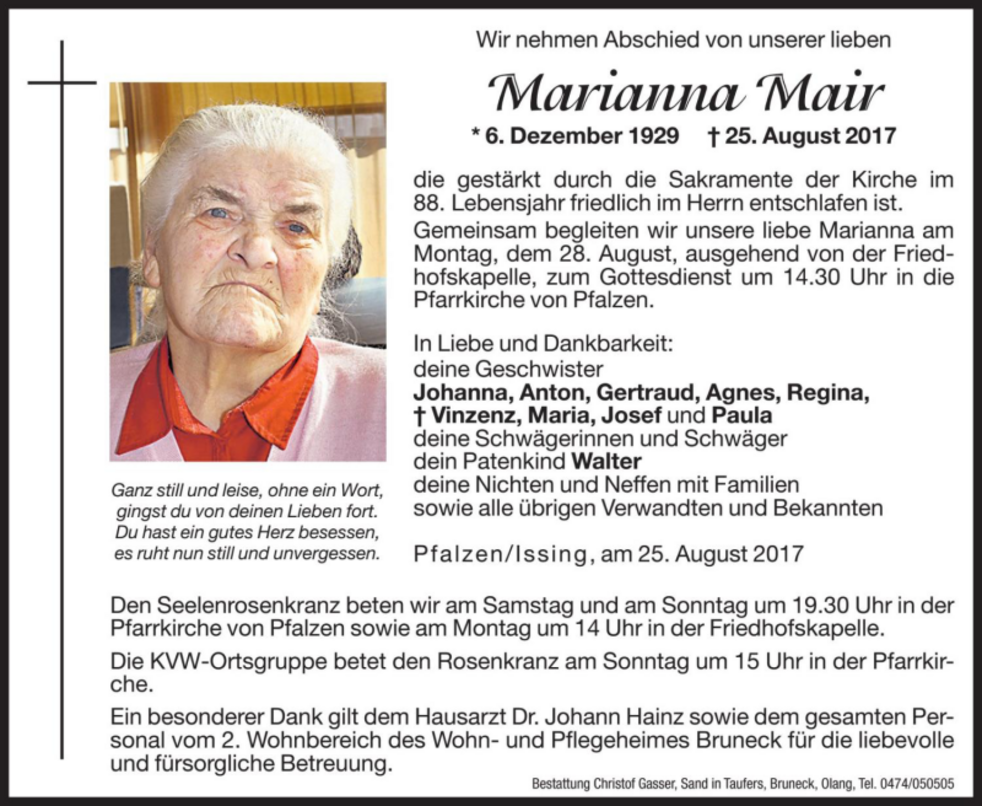 Gemeinsam begleiten wir unsere liebe Marianna am Montag, dem 28. August, ausgehend von der Friedhofskapelle, zum Gottesdienst um 14.30 Uhr in die Pfarrkirche von Pfalzen. Anschließend übergeben wir sie der geweihten Erde.