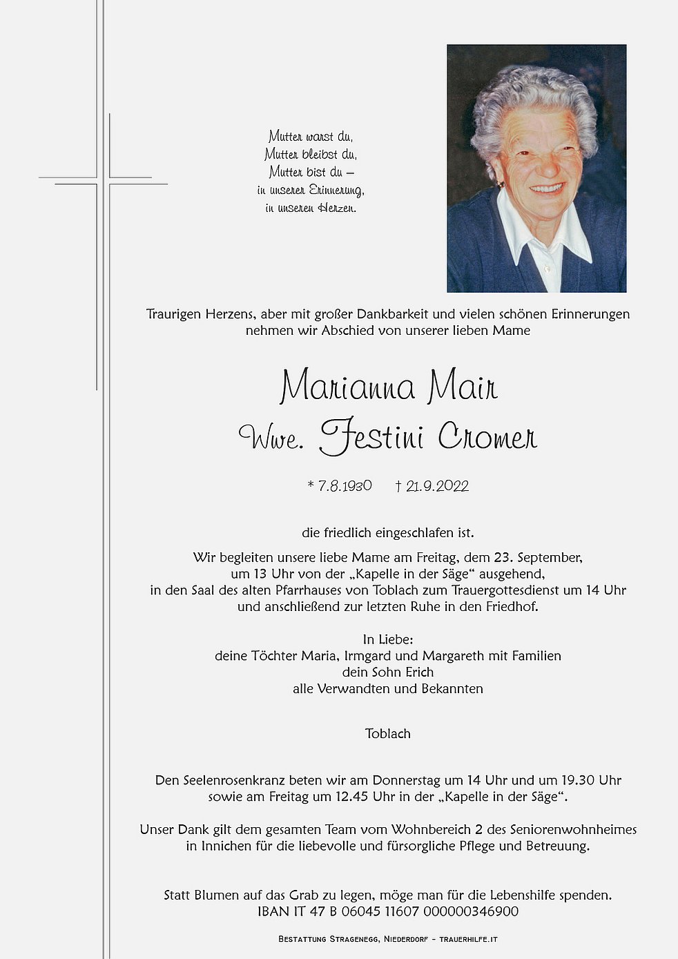Wir begleiten unsere liebe Mame am Freitag, dem 23. September, um 13 Uhr von der „Kapelle in der Säge“ ausgehend, in den Saal des alten Pfarrhauses von Toblach zum Trauergottesdienst um 14 Uhr und anschließend zur letzten Ruhe in den Friedhof.