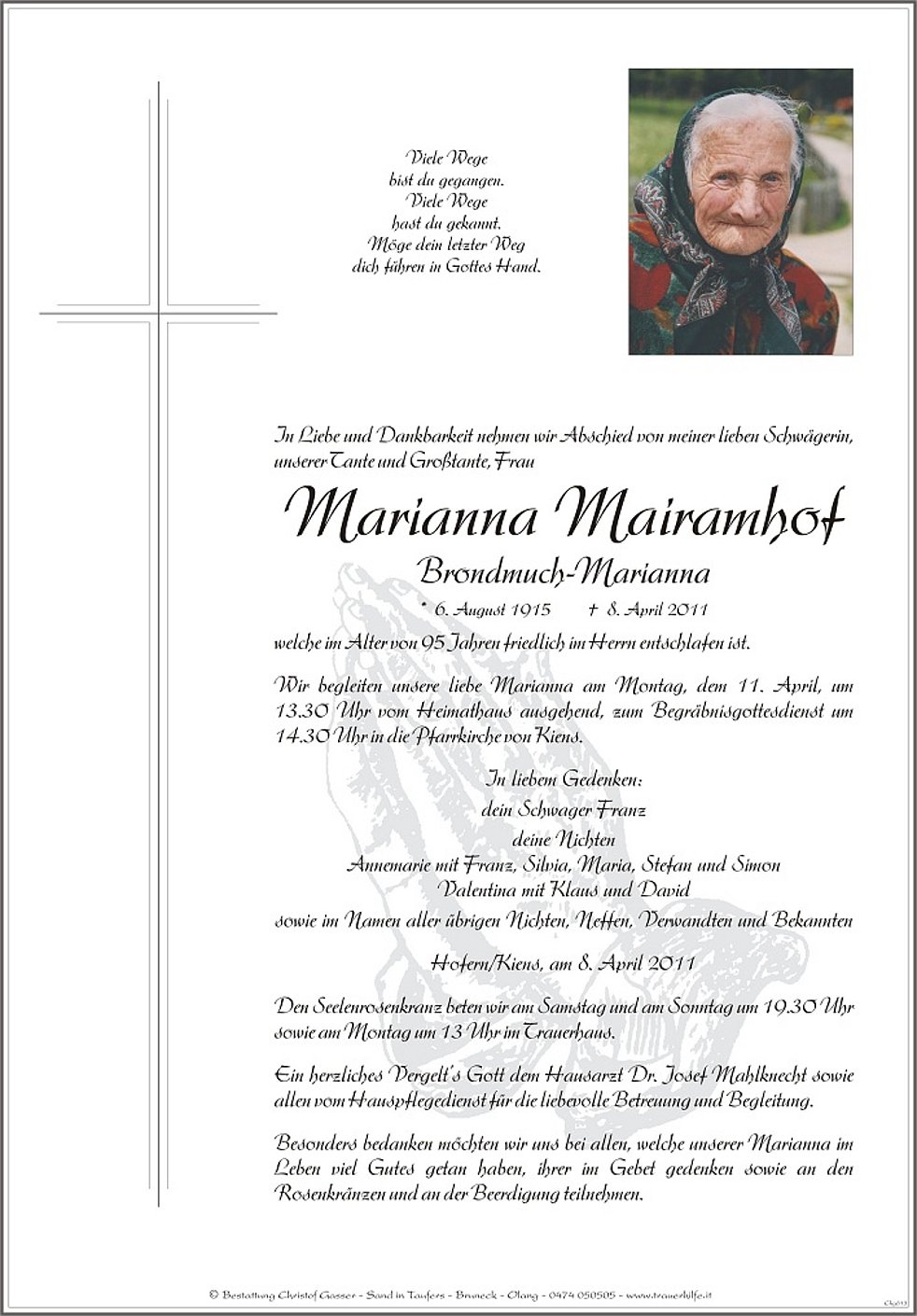 Besonders bedanken möchten wir uns bei allen, welche unserer Marianna im Leben viel Gutes getan haben, ihrer im Gebet gedenken sowie an den Rosenkränzen und an der Beerdigung teilnehmen.