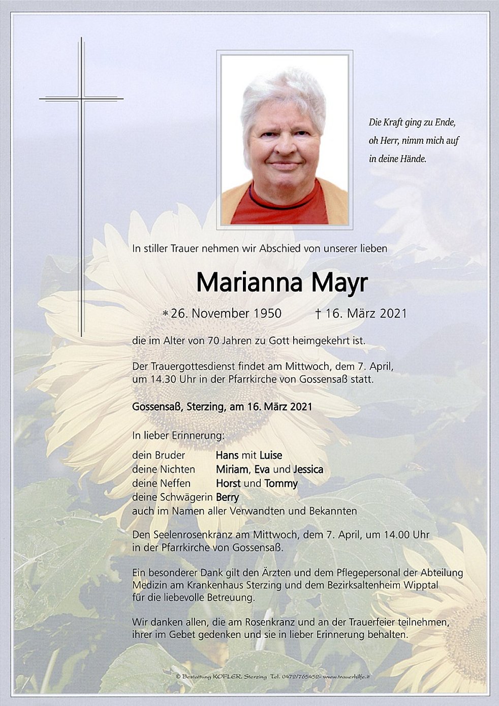 Der Trauergottesdienst findet am Mittwoch, dem 7. April, um 14.30 Uhr in der Pfarrkirche von Gossensaß statt.