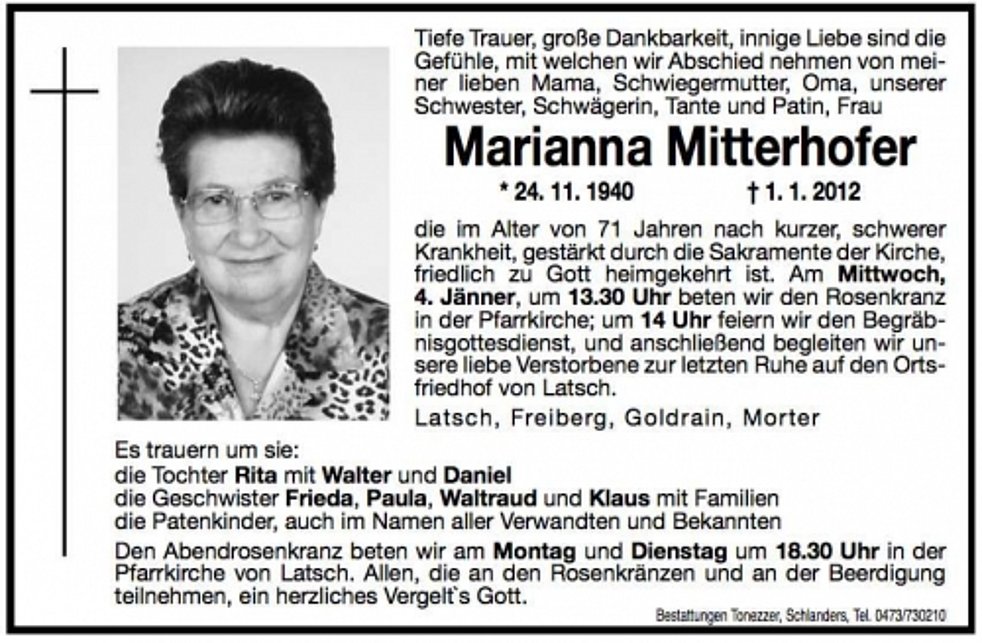 Am Mittwoch, 4. Jänner, um 13.30 Uhr beten wir den Rosenkranz in der Pfarrkirche; um 14 Uhr feiern wir den Begräbnisgottesdienst und anschließend begleiten wir unsere liebe Verstorbene zur letzten Ruhe auf den Ortsfriedhof von Latsch.