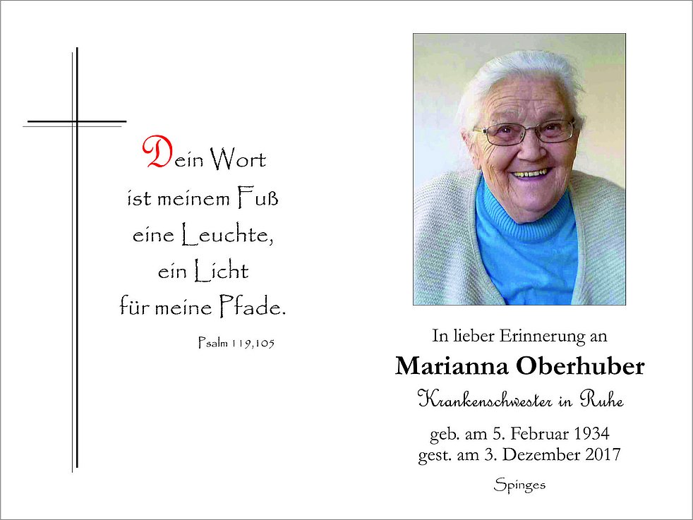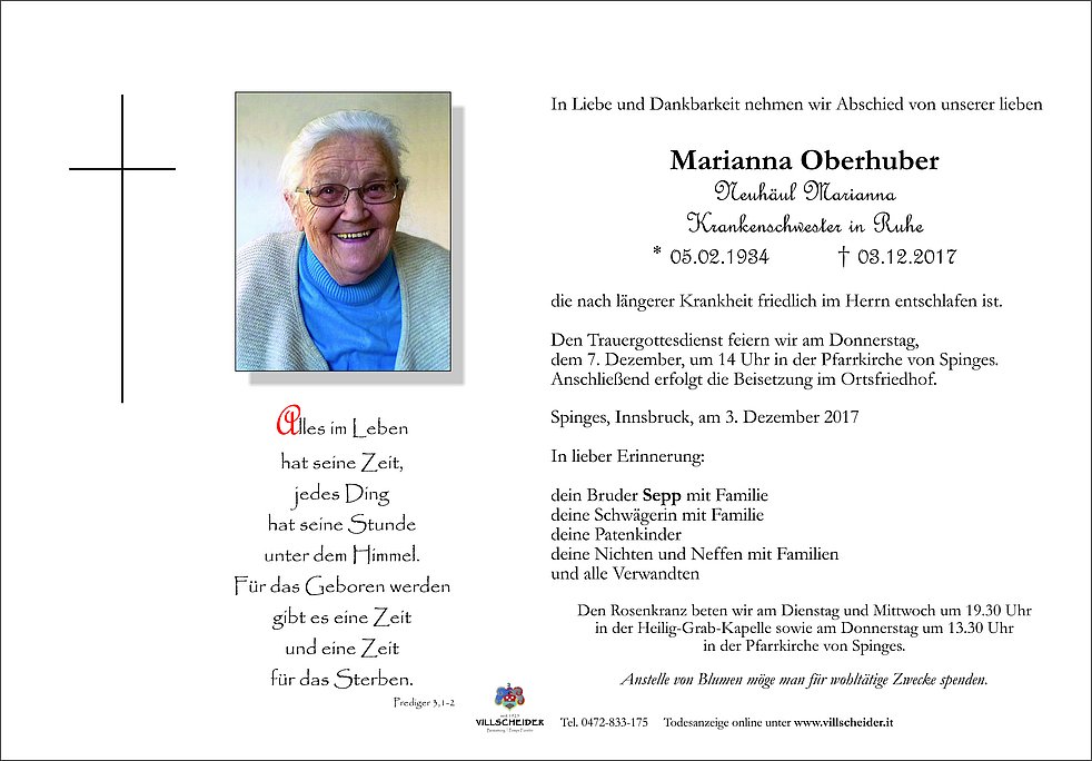 dem 7. Dezember, um 14 Uhr in der Pfarrkirche von Spinges. Anschließend erfolgt die Beisetzung im Ortsfriedhof.