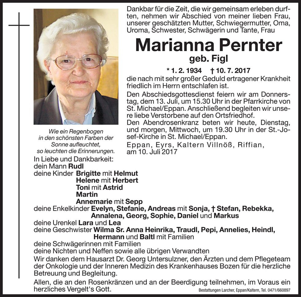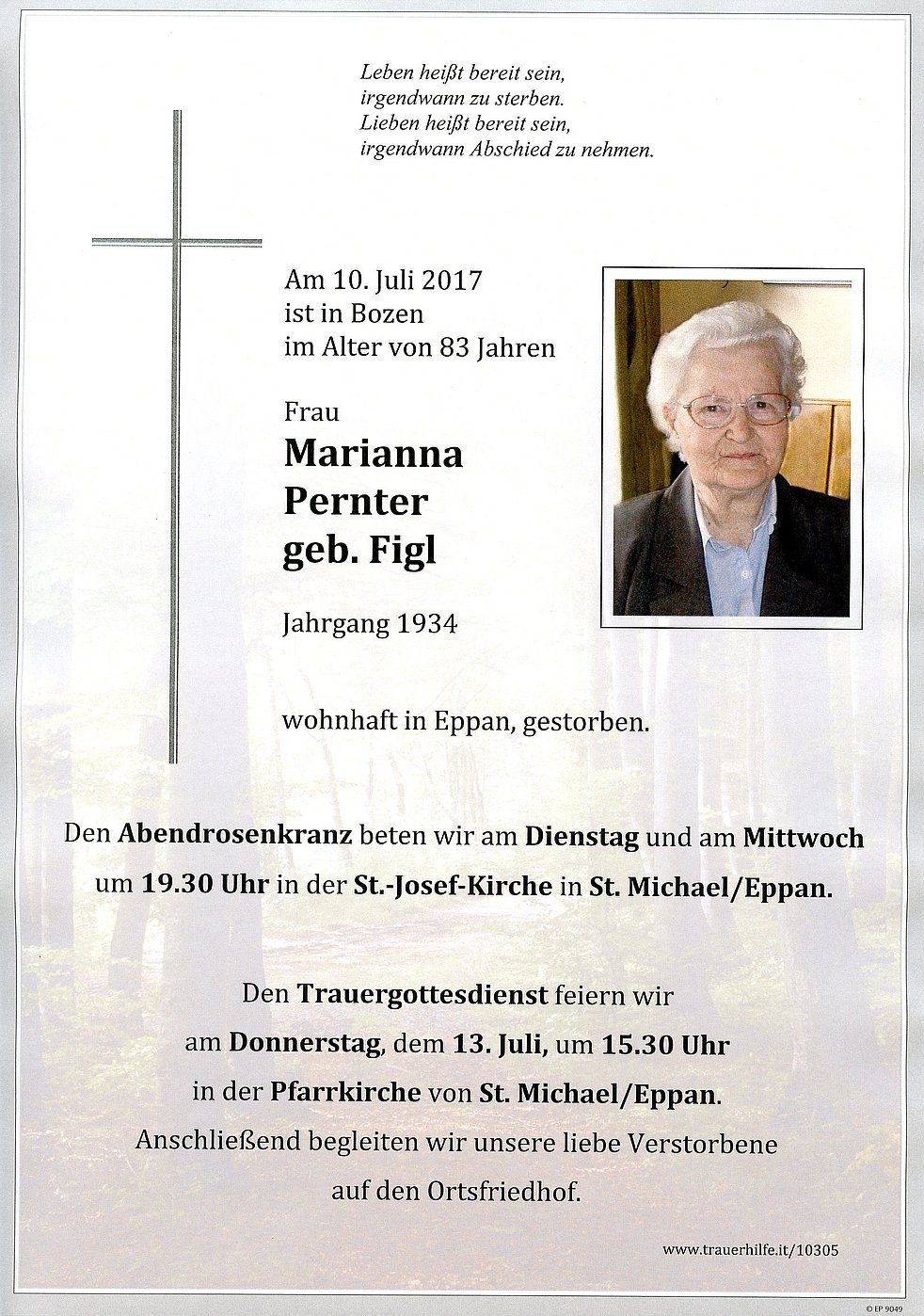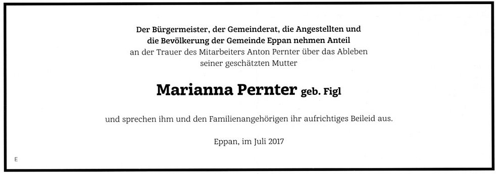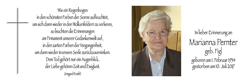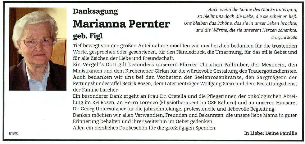 Den Abschiedsgottesdienst feiern wir am Donnerstag, dem 13. Juli um 15.30 Uhr in der Pfarrkirche von St. Michael/Eppan. Anschließend begleiten wir unsere liebe Verstorbene auf den Ortsfriedhof.