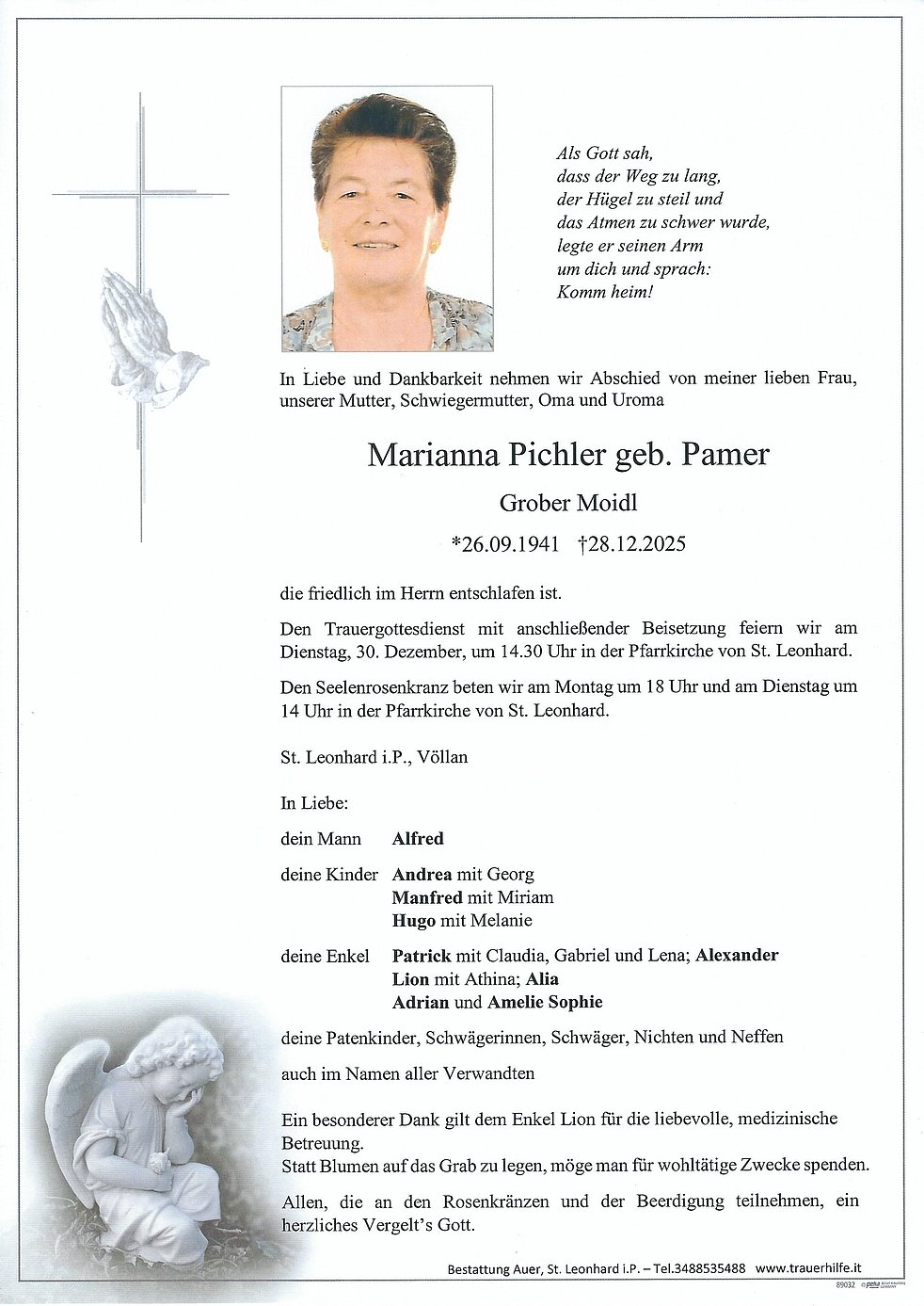 Den Trauergottesdienst mit anschließender Beisetzung feiern wir am Dienstag, 30. Dezember, um 14.30 Uhr in der Pfarrkirche von St. Leonhard.