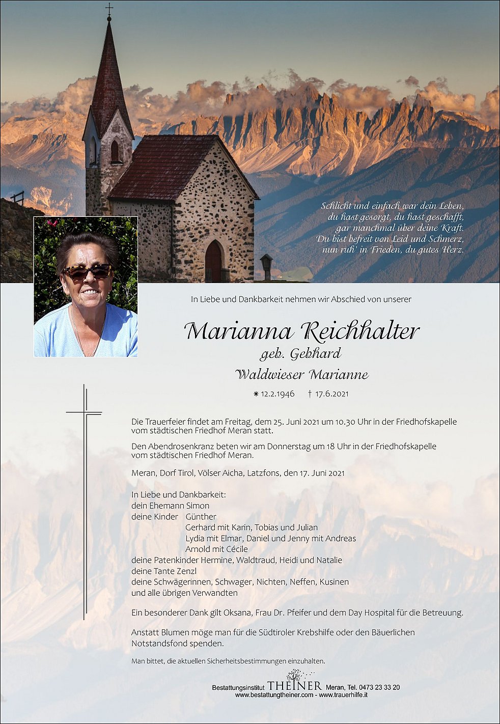Die Trauerfeier findet am Freitag, dem 25. Juni 2021 um 10.30 Uhr in der Friedhofskapelle vom städtischen Friedhof Meran statt.