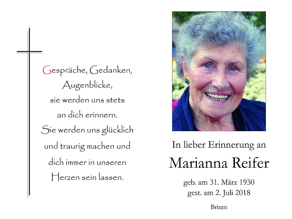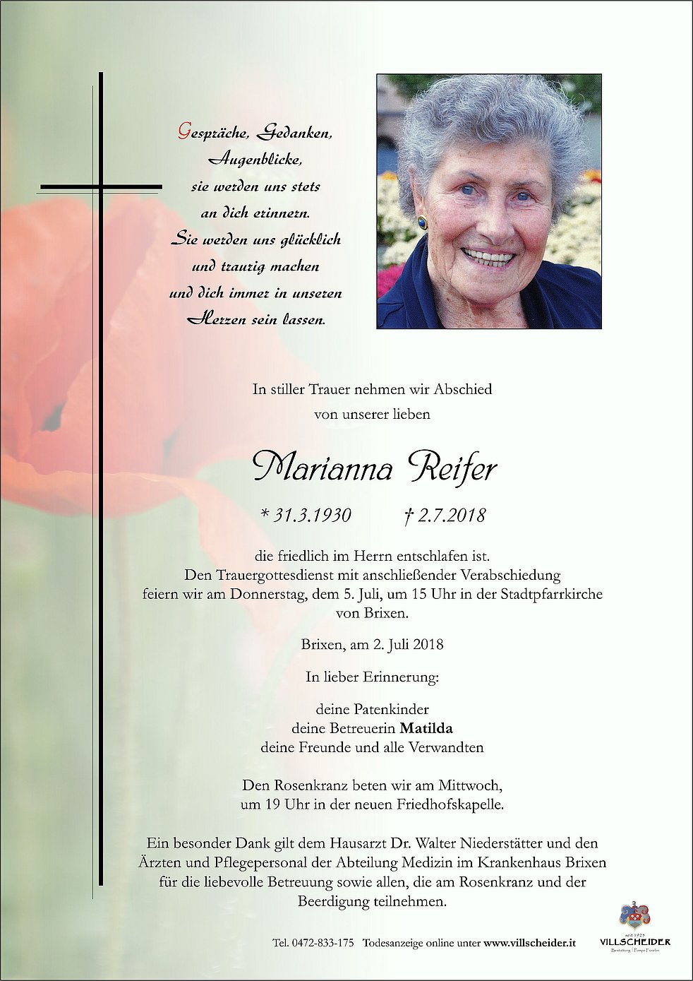 Ein besonder Dank gilt dem Hausarzt Dr. Walter Niederstätter und den Ärzten und Pflegepersonal der Abteilung Medizin im Krankenhaus Brixen für die liebevolle Betreuung sowie allen, die am Rosenkranz und der Beerdigung teilnehmen.