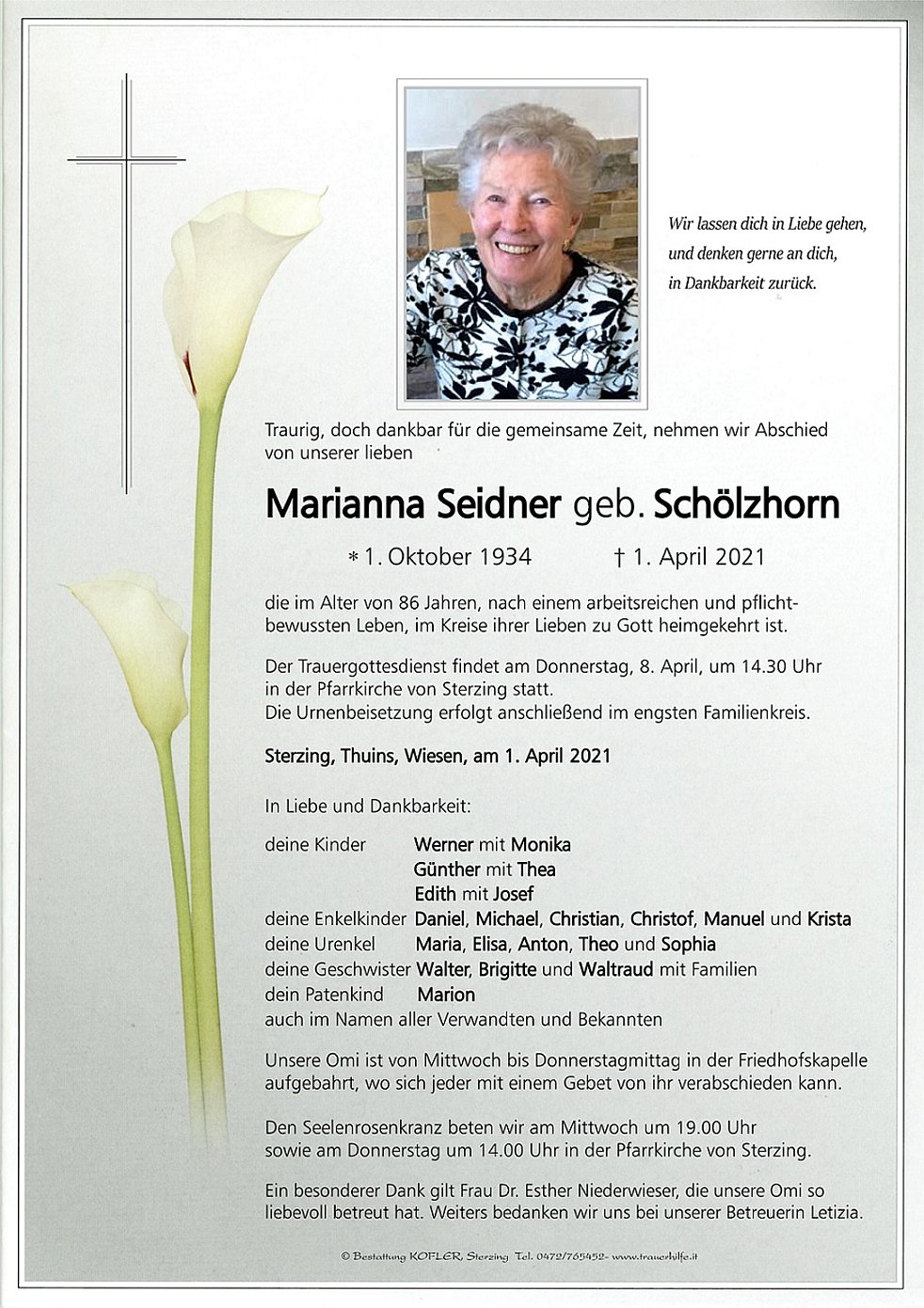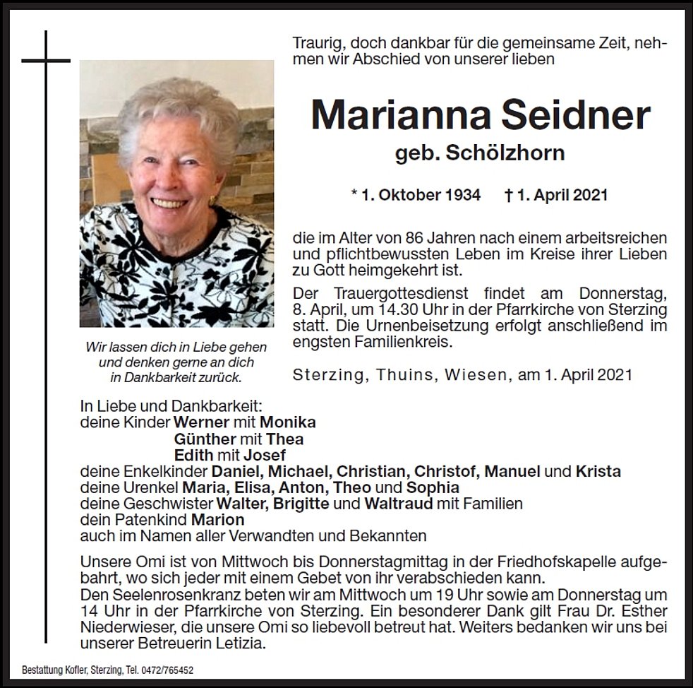 Der Trauergottesdienst findet am Donnerstag, 8. April, um 14.30 Uhr in der Pfarrkirche von Sterzing statt. Die Urnenbeisetzung erfolgt anschließend im engsten Familienkreis.