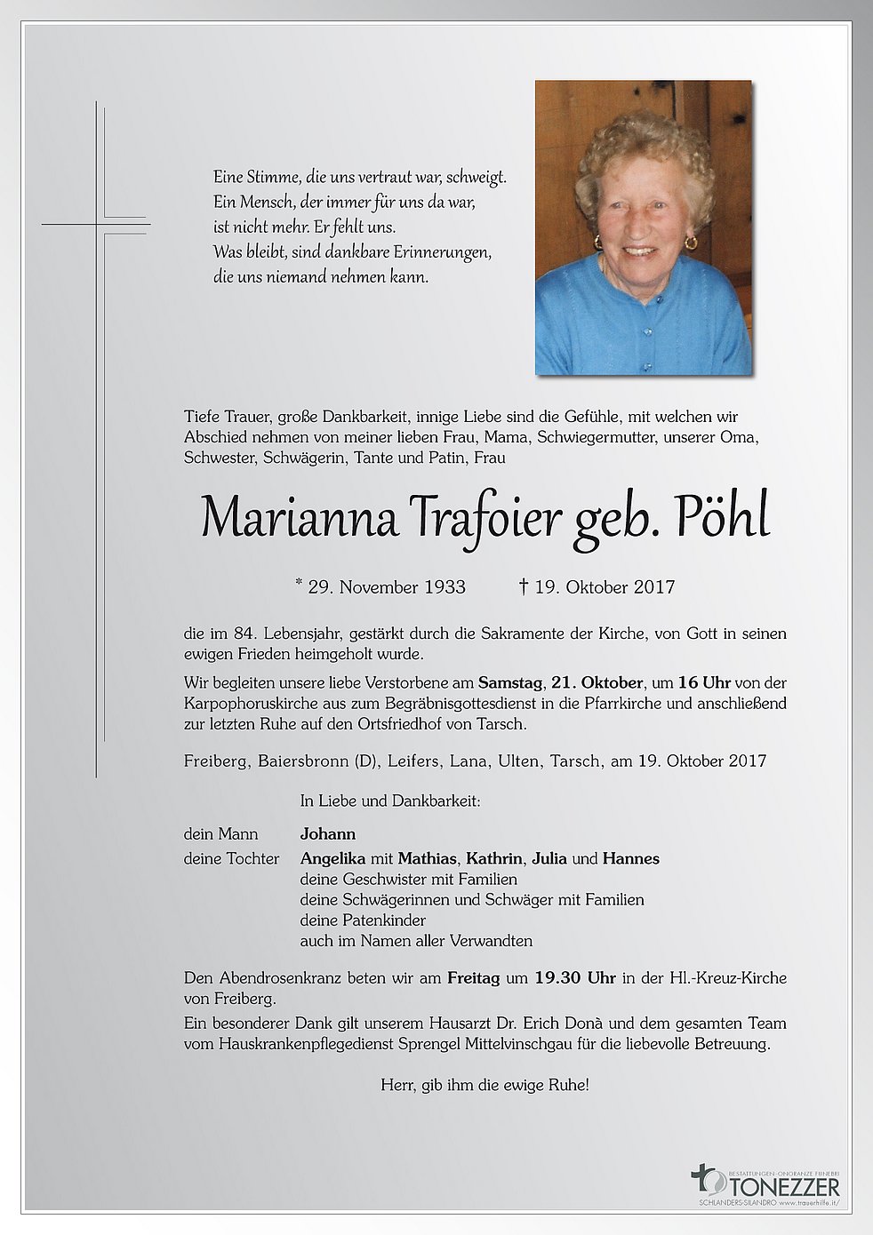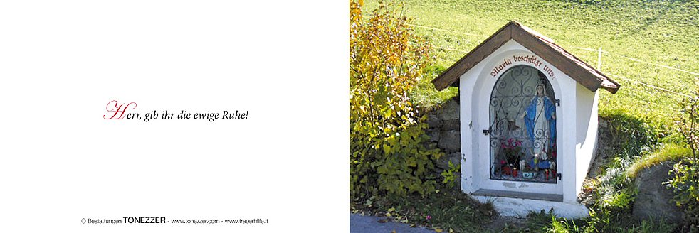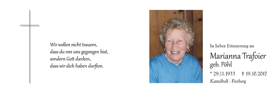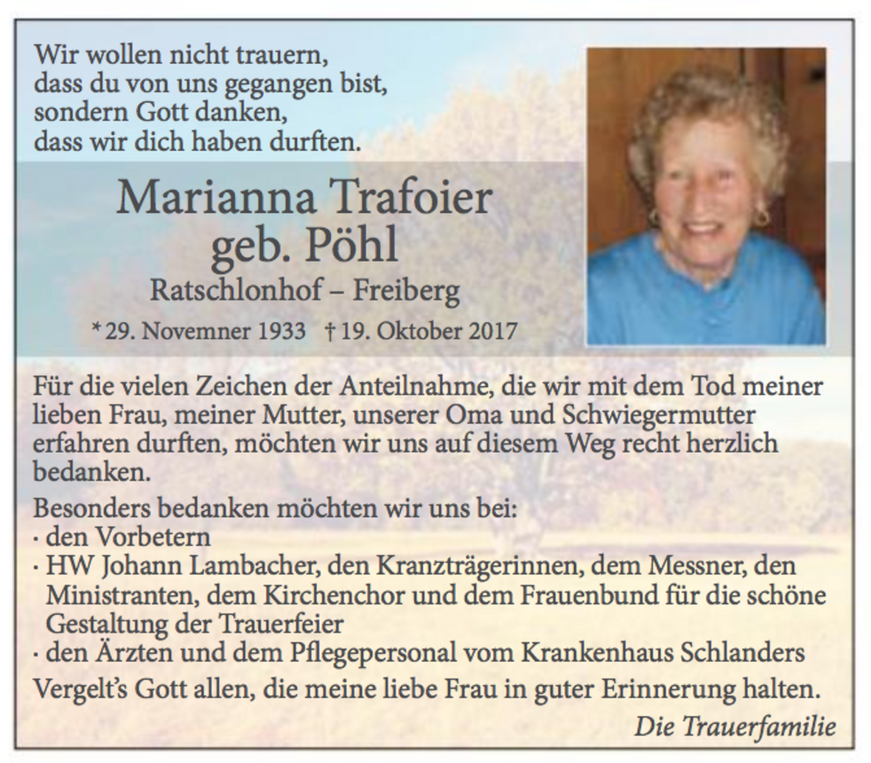 Wir begleiten unsere liebe Verstorbene am Samstag, 21. Oktober, um 16 Uhr von der Karpophoruskirche aus zum Begräbnisgottesdienst in die Pfarrkirche und anschließend zur letzten Ruhe auf den Ortsfriedhof von Tarsch.