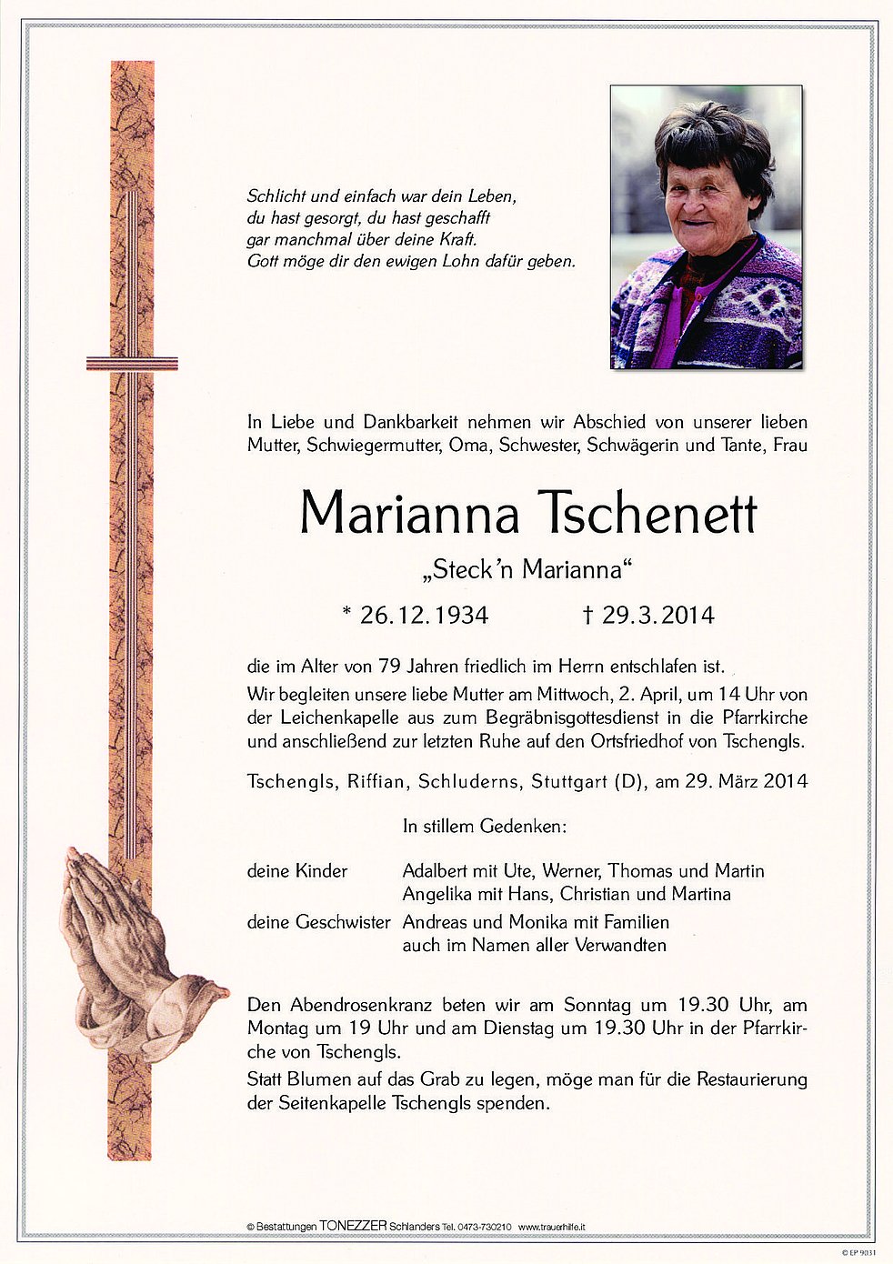 Wir begleiten unsere liebe Mutter am Mittwoch, 2. April, um 14 Uhr von der Leichenkapelle aus zum Begräbnisgottesdienst in die Pfarrkirche und anschließend zur letzten Ruhe auf den Ortsfriedhof von Tschengls.