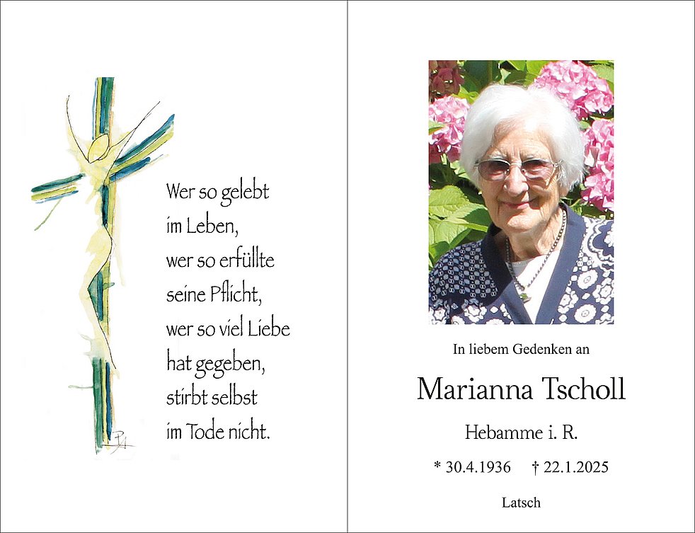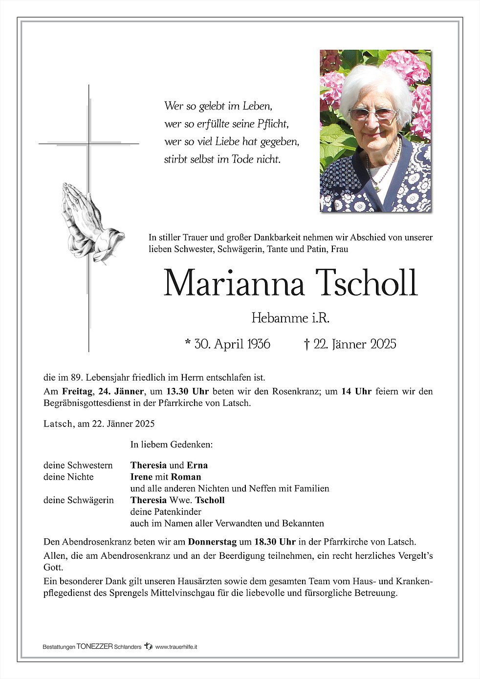 Wir drücken allen Angehörigen unser aufrichtiges Mitgefühl und herzliches Beileid aus. Erinnerungen, die unser Herz berühren, gehen niemals verloren. Wir werden Marianna als liebenswerten und sehr gläubigen Menschen in Erinnerung behalten. Möge die Gnaden Mutter der Latscher Brücke dich in deine neue Heimat begleiten. Ruhe in Frieden
