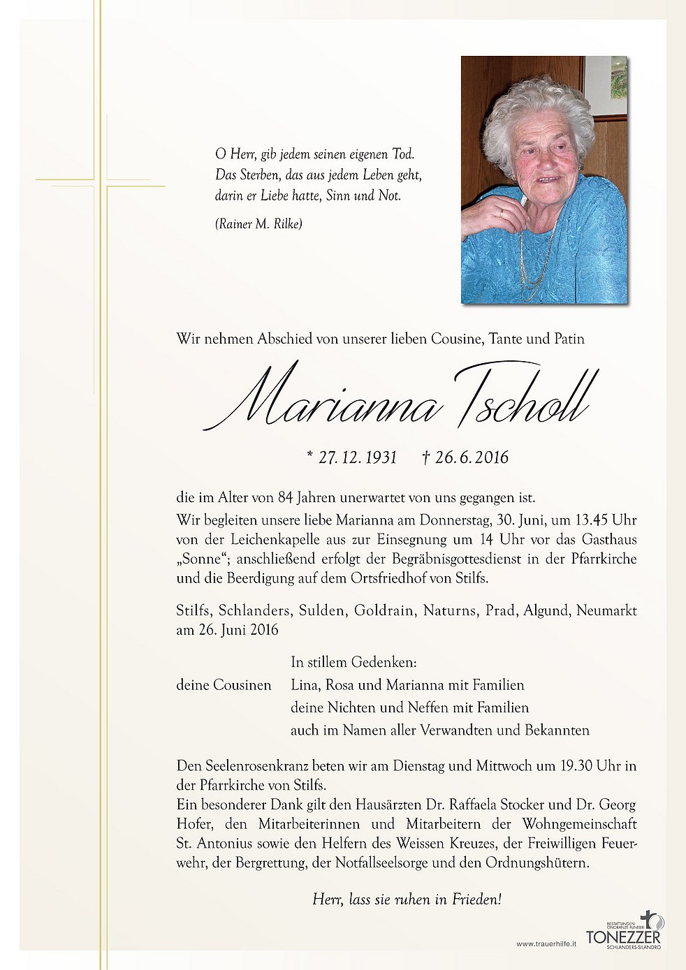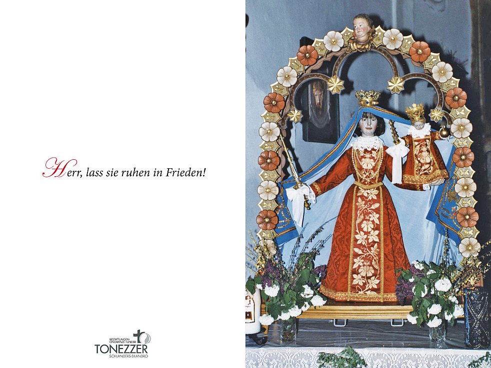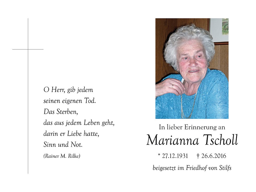 Wir begleiten unsere liebe Marianna am Donnerstag, 30. Juni, um 13.45 Uhr von der Leichenkapelle aus zur Einsegnung um 14 Uhr vor das Gasthaus „Sonne“; anschließend erfolgt der Begräbnisgottesdienst in der Pfarrkirche und die Beerdigung auf dem Ortsfriedhof von Stilfs.