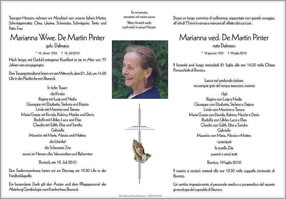 Den Trauergottesdienst feiern wir am Mittwoch, dem 21. Juli, um 14.00 Uhr in der Pfarrkirche von Bruneck.