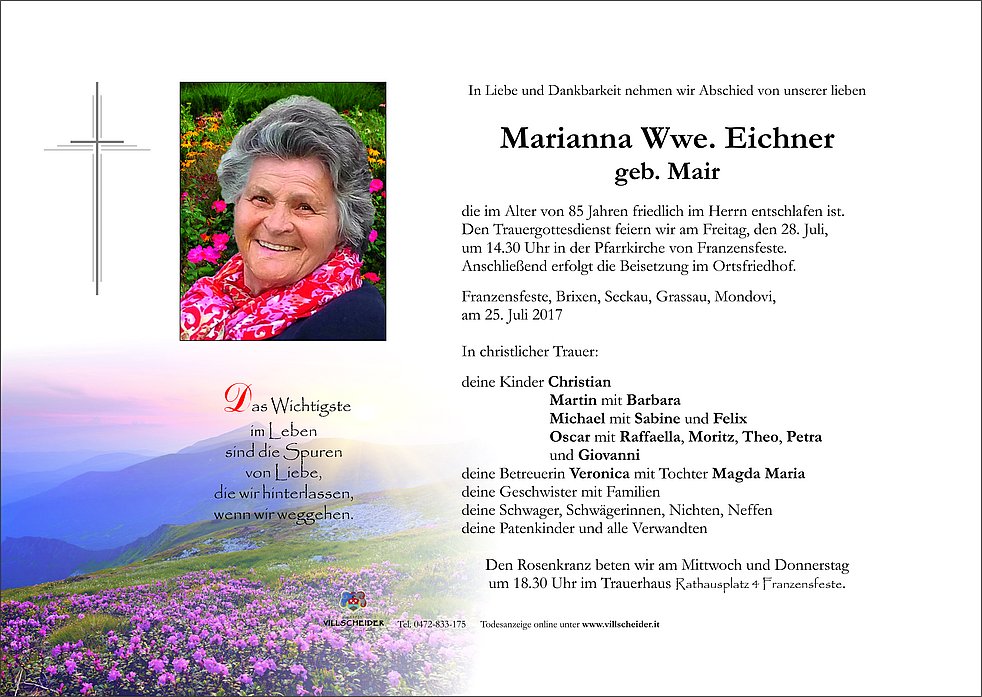 um 18.30 Uhr im Trauerhaus Rathausplatz 4 Franzensfeste.