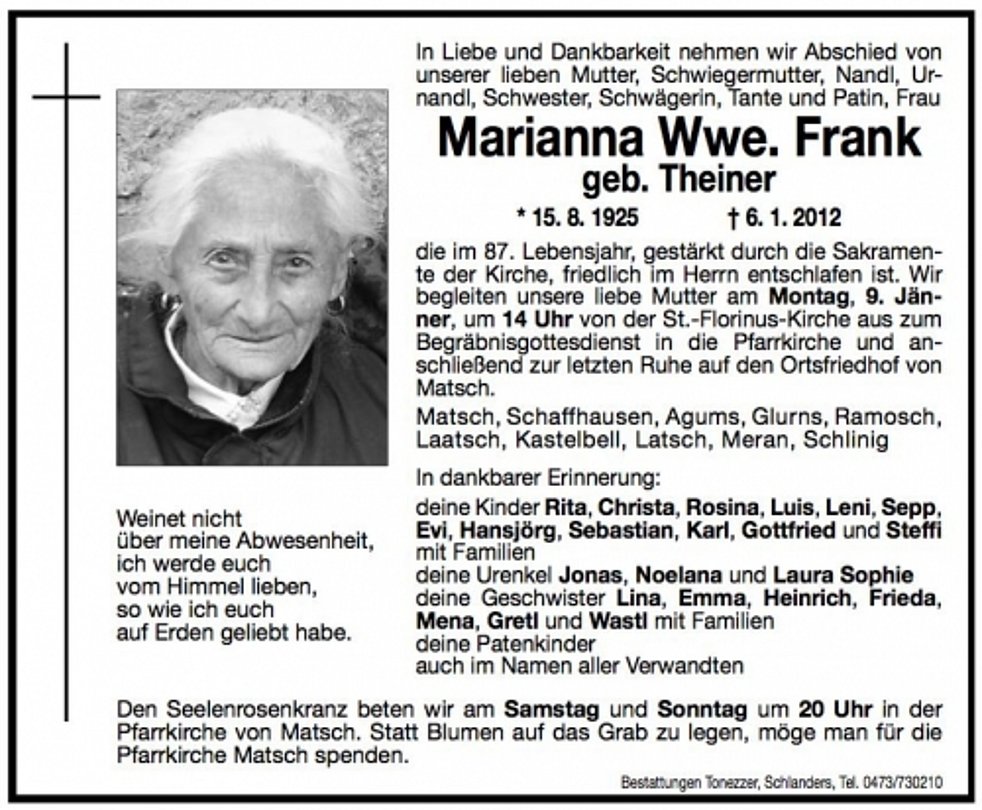 Wir begleiten unsere liebe Mutter am Montag, 9. Jänner, um 14 Uhr von der St.-Florinus-Kirche aus zum Begräbnisgottesdienst in die Pfarrkirche und anschließend zur letzten Ruhe auf den Ortsfriedhof von Matsch.