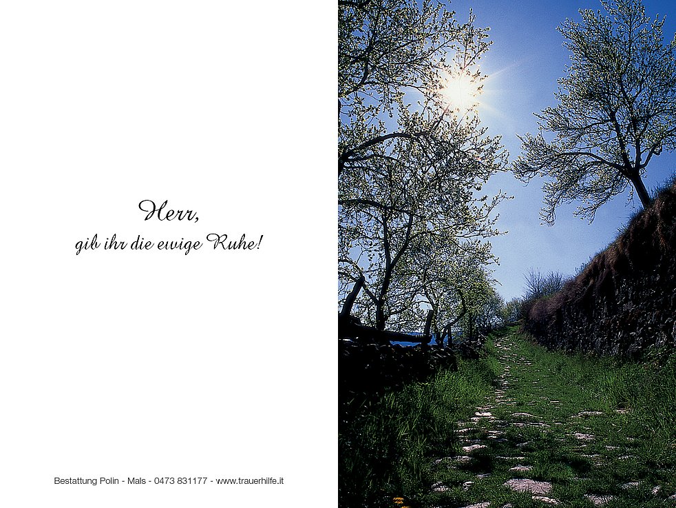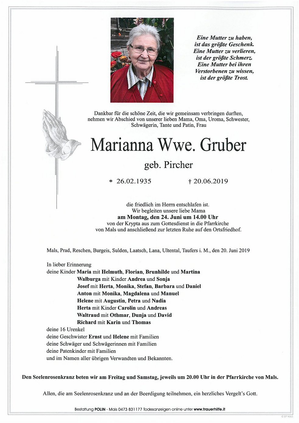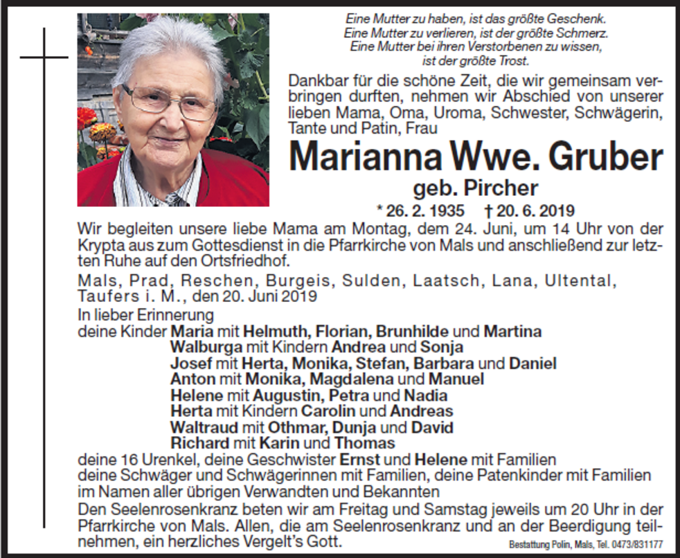 Wir begleiten unsere liebe Mama am Montag, den 24. Juni um 14.00 Uhr von der Krypta aus zum Gottesdienst in die Pfarrkirche von Mals und anschließend zur letzten Ruhe auf den Ortsfriedhof.