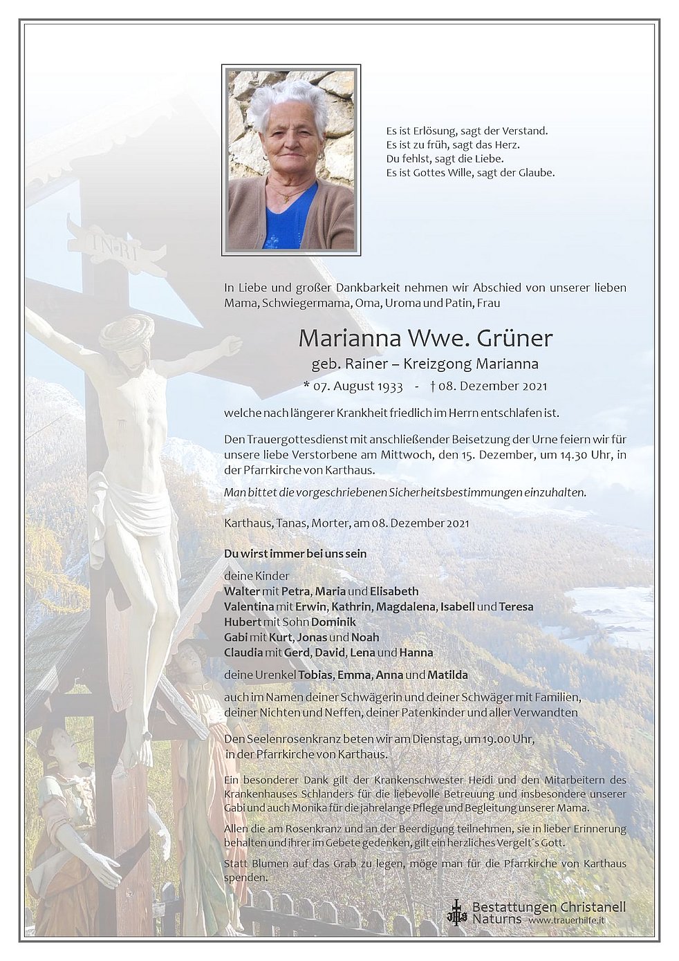Den Trauergottesdienst mit anschließender Beisetzung der Urne feiern wir für unsere liebe Verstorbene am Mittwoch, den 15. Dezember, um 14.30 Uhr, in der Pfarrkirche von Karthaus.