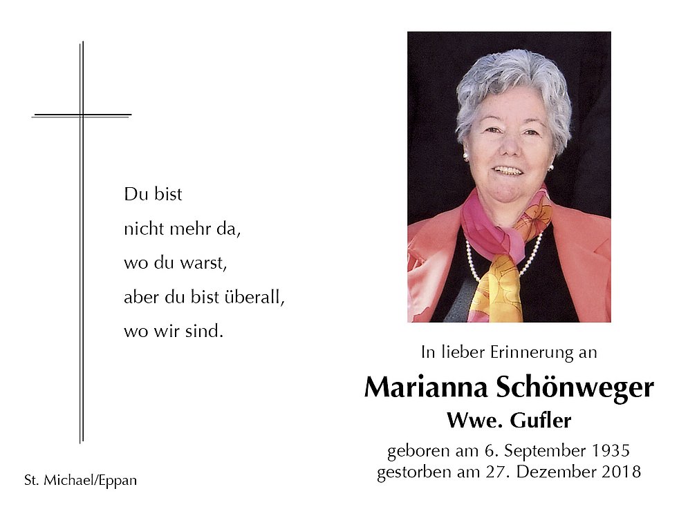Den Trauergottesdienst mit anschließender Verabschiedung feiern wir am Samstag, dem 29. Dezember um 13.30 Uhr in der Pfarrkirche von St. Michael/Eppan. Den Abendrosenkranz beten wir am Freitag um 19.30 Uhr in der St. Josefs-Kirche in St. Michael/Eppan.
