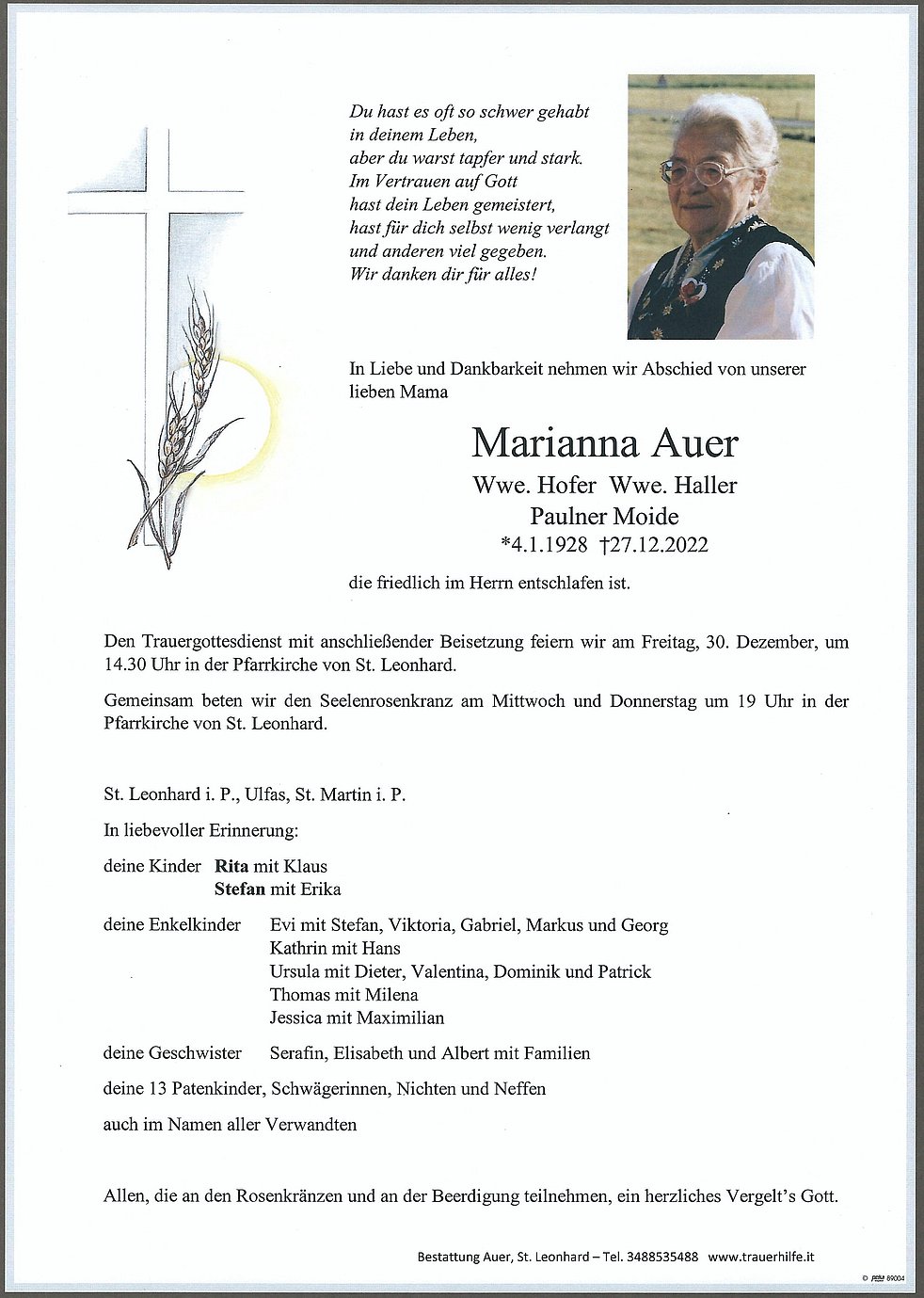 Den Trauergottesdienst mit anschließender Beisetzung feiern wir am Freitag, 30. Dezember, um 14.30 Uhr in der Pfarrkirche von St. Leonhard.
