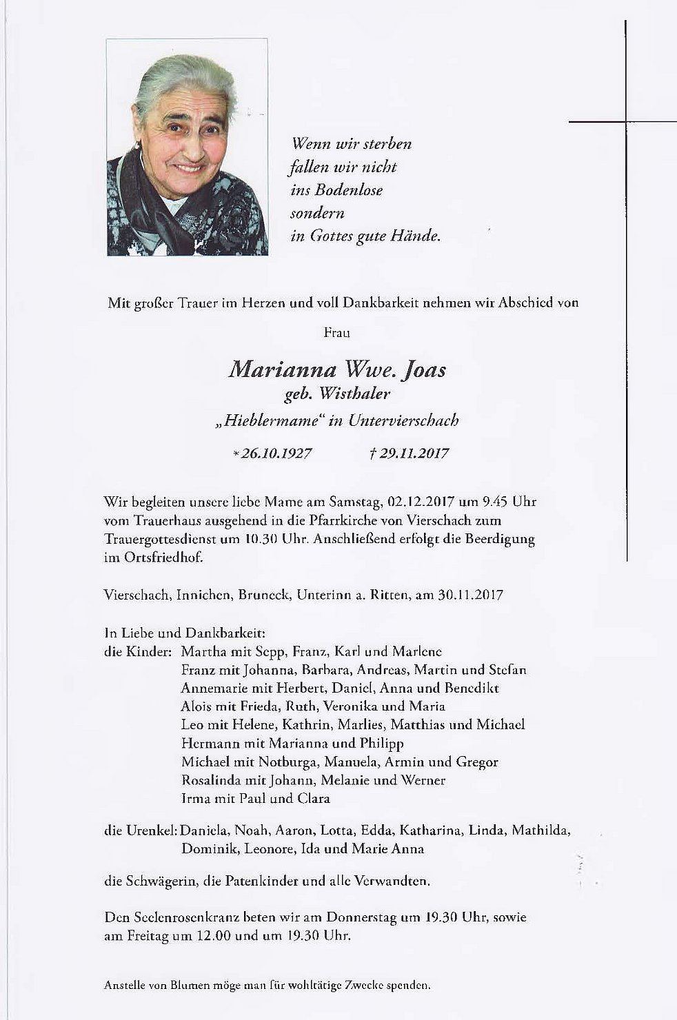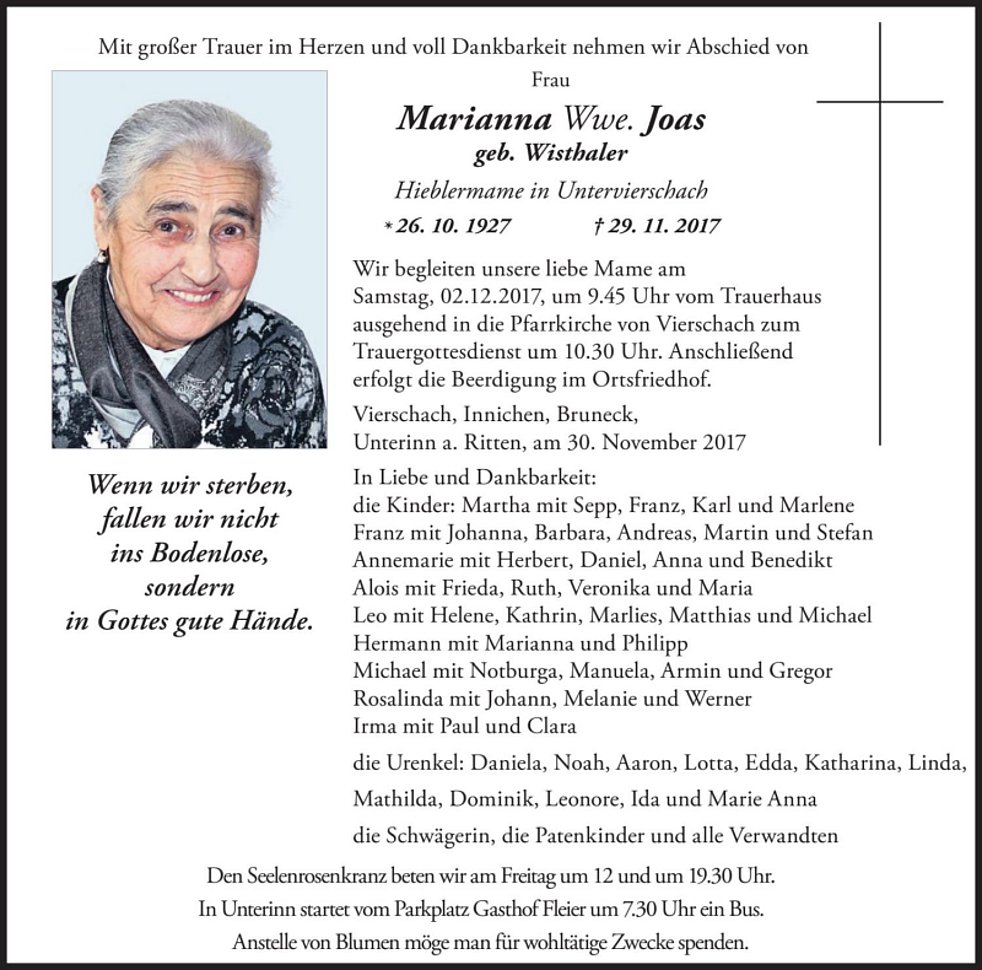 Wir begleiten unsere liebe Mame am Samstag, 2. Dezember 2017, um 9.45 Uhr vom Trauerhaus ausgehend in die Pfarrkirche von Vierschach zum Trauergottesdienst um 10.30 Uhr. Anschließend erfolgt die Beerdigung im Ortsfriedhof.