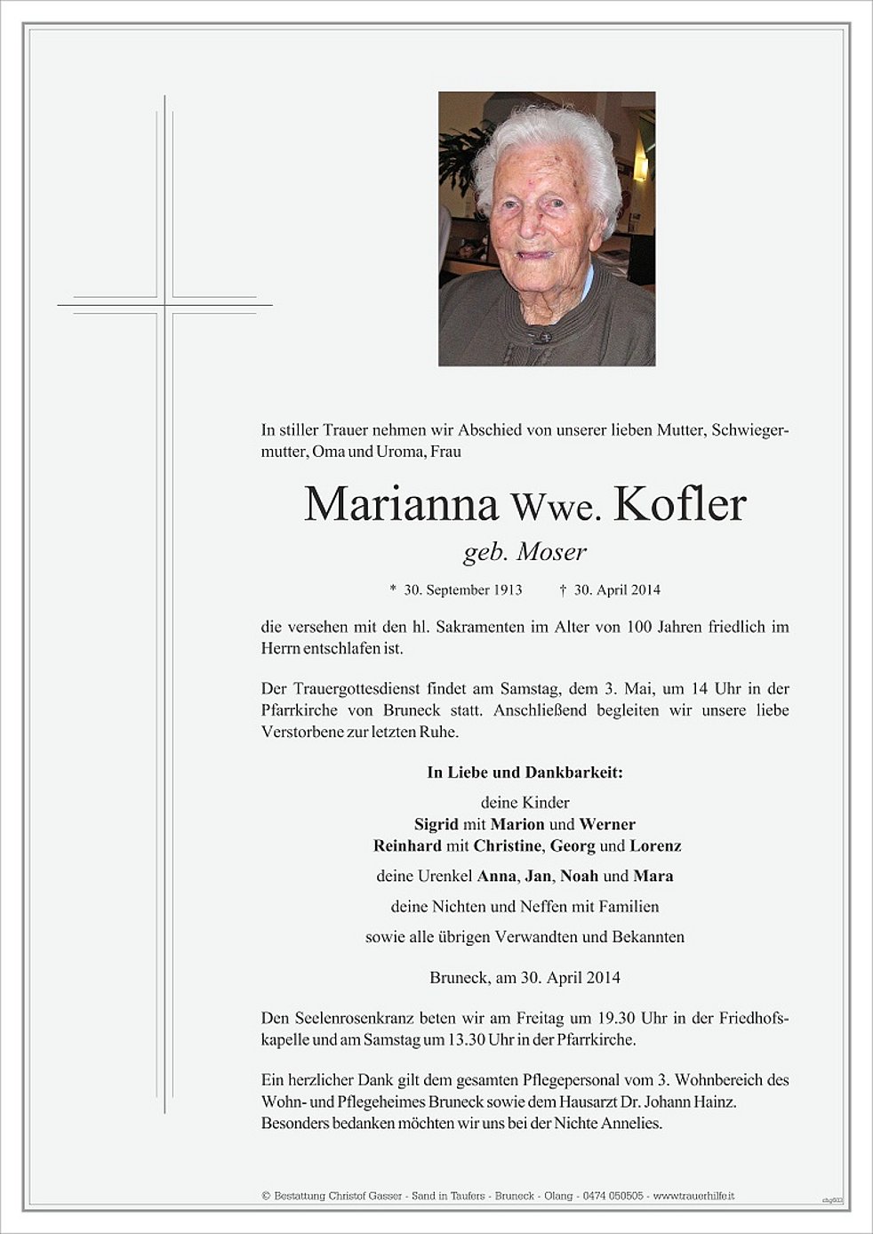 Der Trauergottesdienst findet am Samstag, dem 3. Mai, um 14 Uhr in der Pfarrkirche von Bruneck statt. Anschließend begleiten wir unsere liebe Verstorbene zur letzten Ruhe.