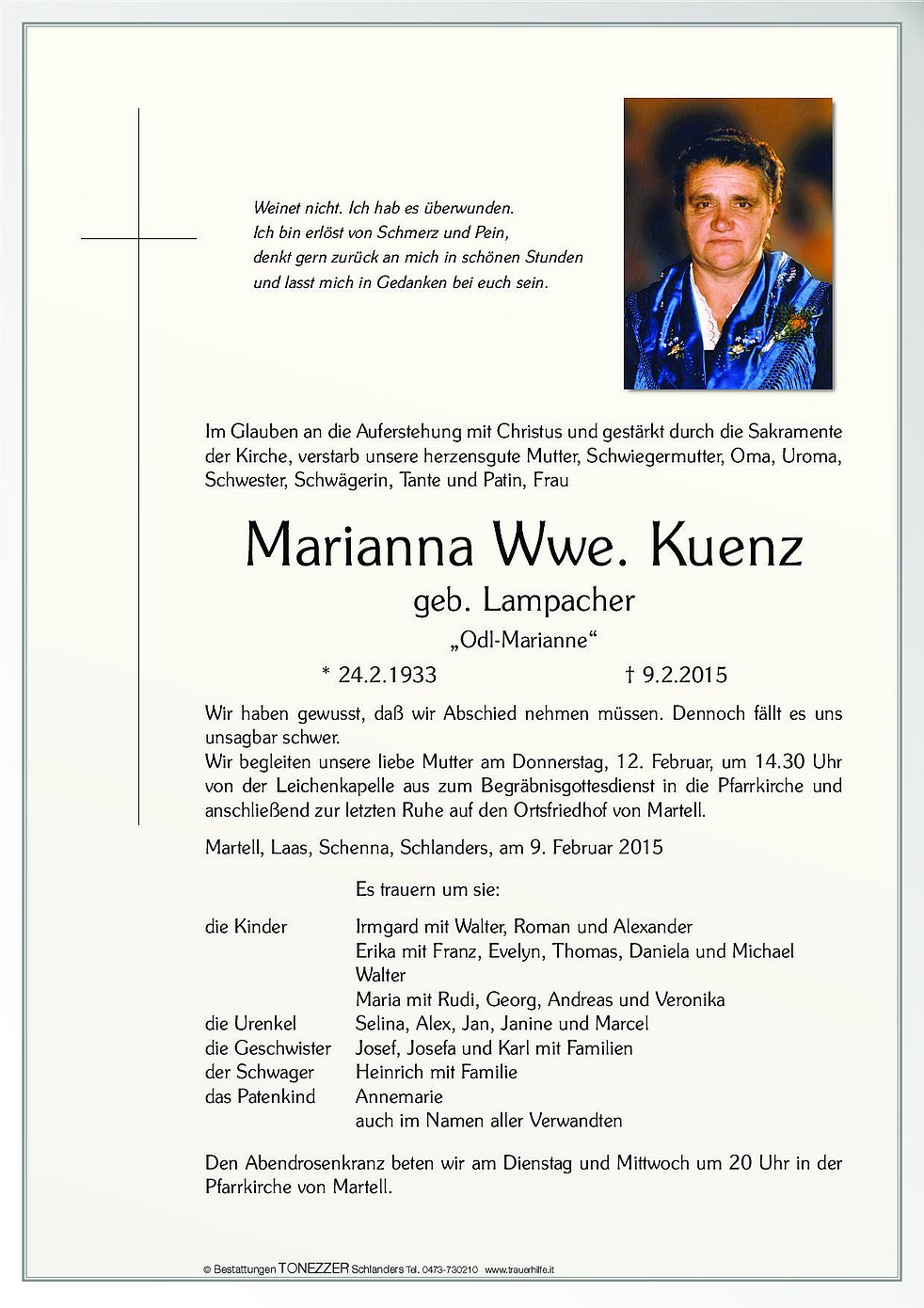 Wir begleiten unsere liebe Mutter am Donnerstag, 12. Februar, um 14.30 Uhr von der Leichenkapelle aus zum Begräbnisgottesdienst in die Pfarrkirche und anschließend zur letzten Ruhe auf den Ortsfriedhof von Martell.