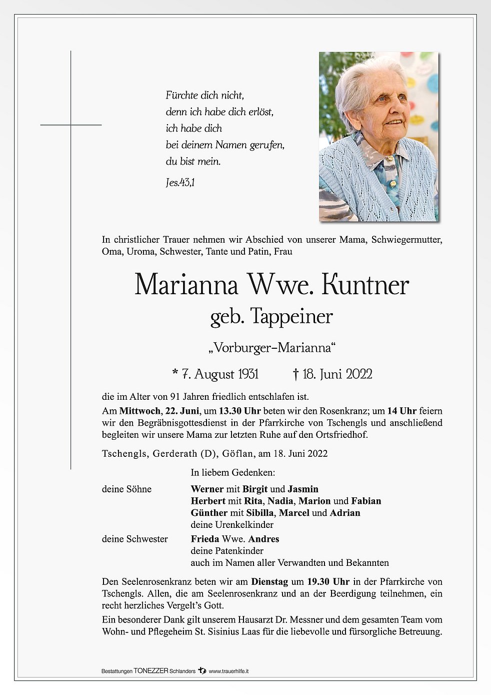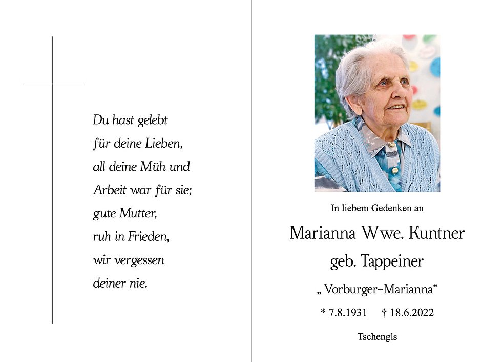 Am Mittwoch, 22. Juni, um 13.30 Uhr beten wir den Rosenkranz; um 14 Uhr feiern wir den Begräbnisgottesdienst in der Pfarrkirche von Tschengls und anschließend begleiten wir unsere Mama zur letzten Ruhe auf den Ortsfriedhof.