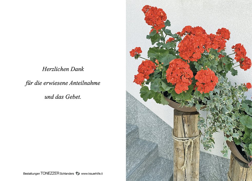 Ein besonderer Dank gilt unserem Hausarzt Dr. Messner und dem gesamten Team vom Wohn- und Pflegeheim St. Sisinius Laas für die liebevolle und fürsorgliche Betreuung.