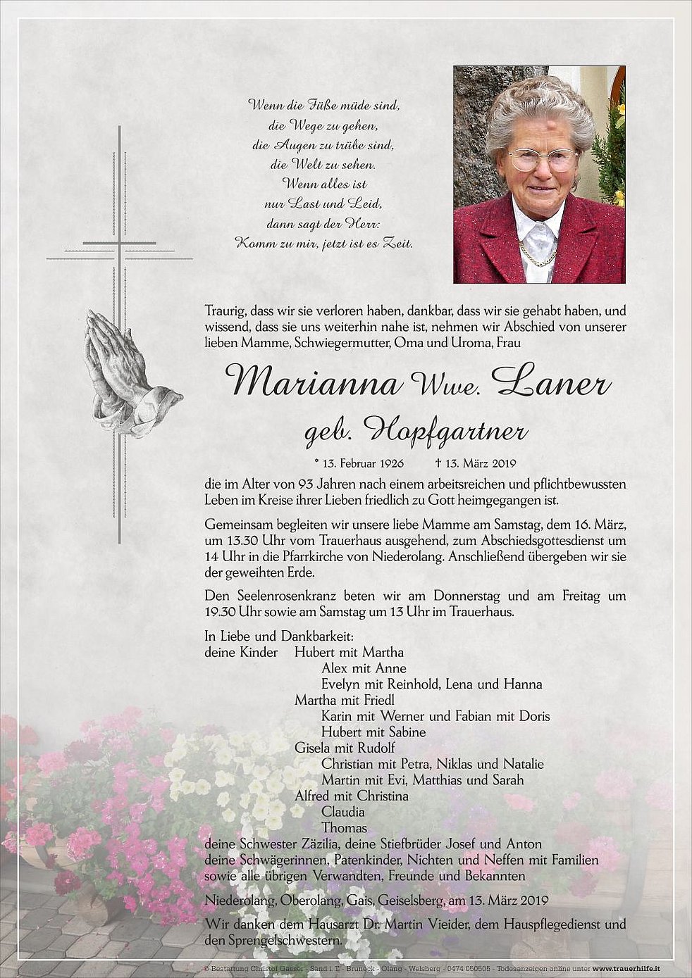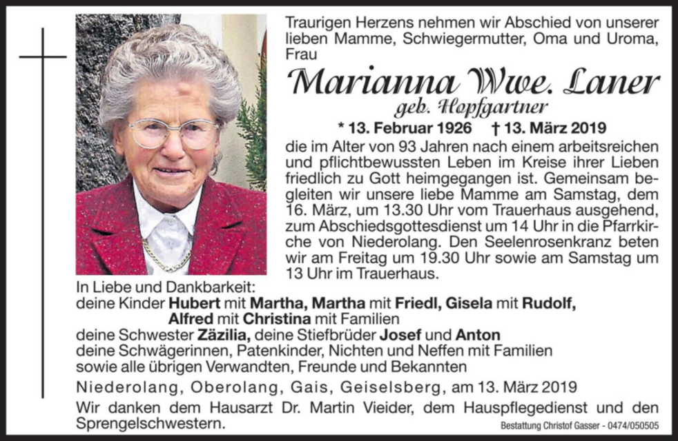 Gemeinsam begleiten wir unsere liebe Mamme am Samstag, dem 16. März, um 13.30 Uhr vom Trauerhaus ausgehend, zum Abschiedsgottesdienst um 14 Uhr in die Pfarrkirche von Niederolang. Anschließend übergeben wir sie der geweihten Erde.