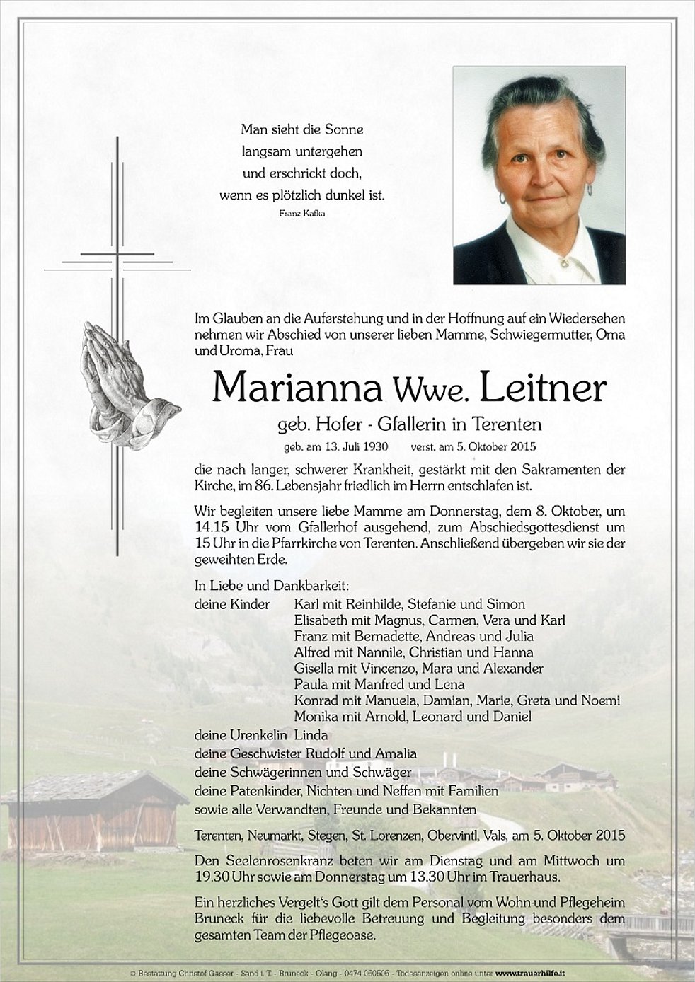 Wir begleiten unsere liebe Mamme am Donnerstag, dem 8. Oktober, um 14.15 Uhr vom Gfallerhof ausgehend, zum Abschiedsgottesdienst um