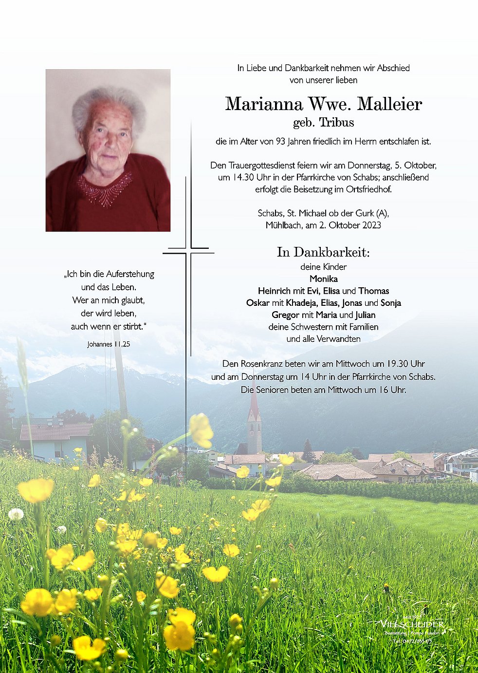 Begräbnisgottesdienst: 05.10. - 14:30 Uhr Schabs