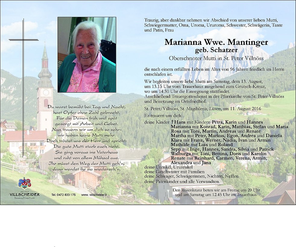 Anschließend Trauergottesdienst in der Pfarrkirche von St. Peter Villnöss und Beisetzung im Ortsfriedhof.