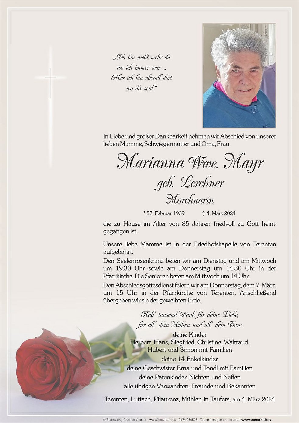 Unsere liebe Mamme ist in der Friedhofskapelle von Terenten aufgebahrt.