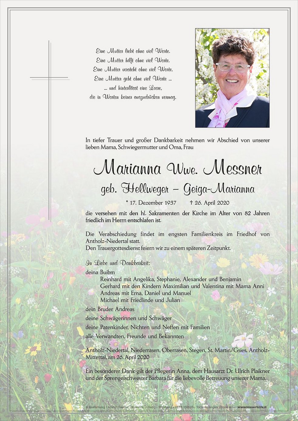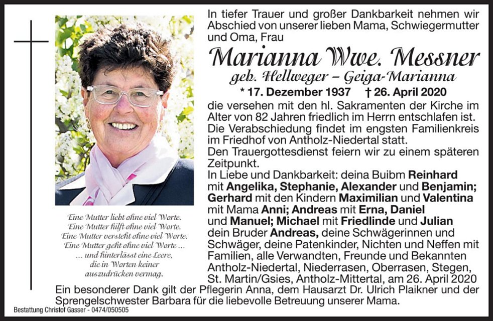 Ein besonderer Dank gilt der Pflegerin Anna, dem Hausarzt Dr. Ulrich Plaikner und der Sprengelschwester Barbara für die liebevolle Betreuung unserer Mama.