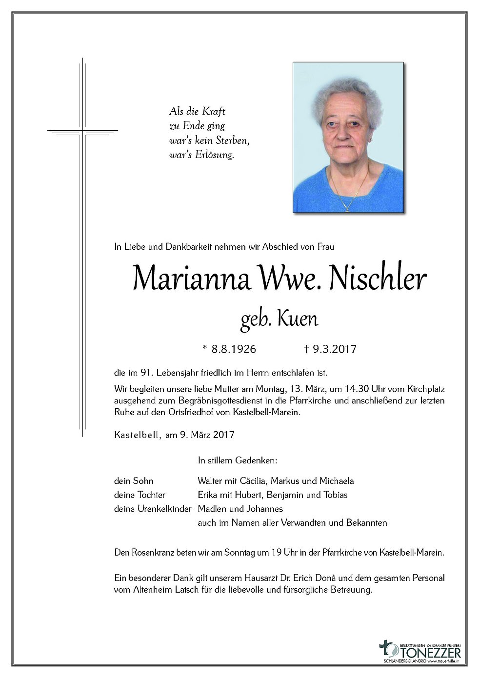 Wir begleiten unsere liebe Mutter am Montag, 13. März, um 14.30 Uhr vom Kirchplatz ausgehend zum Begräbnisgottesdienst in die Pfarrkirche und anschließend zur letzten Ruhe auf den Ortsfriedhof von Kastelbell-Marein.